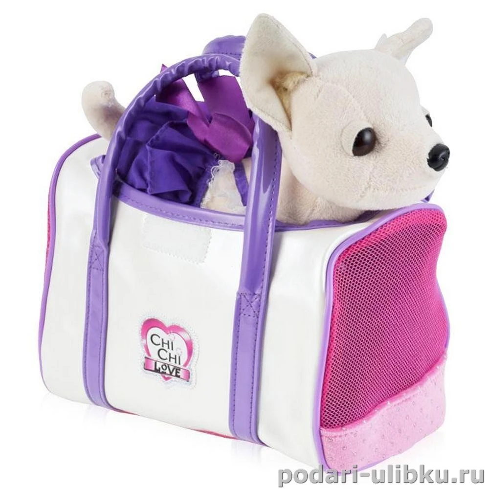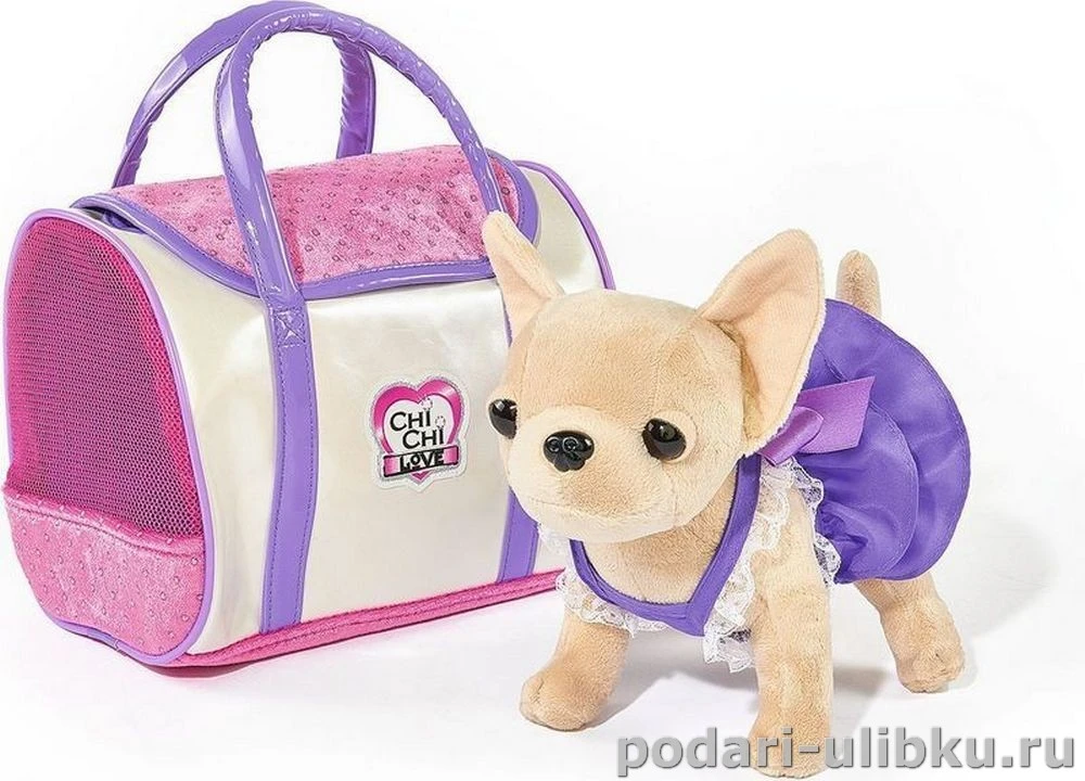 Chi Chi Love плюшевая собачка - мягкая реалистичная Чухуахуа и миленьком фиолетовом сарафанчике и с сумочкой - переноской.