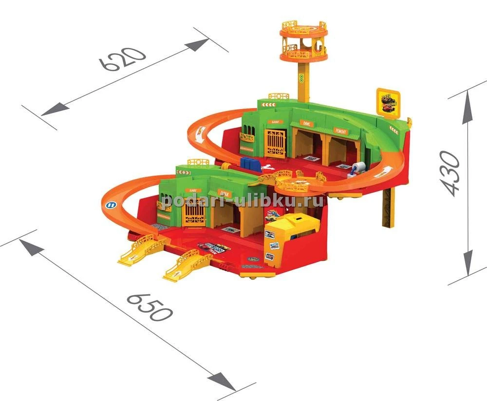 Игрушка представляет собой двухуровневую парковку с вертолетной площадкой, каждый уровень которой отведен под определенную цель. На нижнем уровне располагаются гараж и кафе, в котором можно отдохнуть после тяжелого дня. Второй уровень включает в себя: офис, ремонт и банк. На самом верху находится специальная площадка для посадки вертолета.