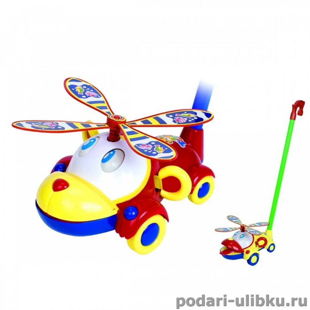 У каталки большие колеса, которые позволяют катать её даже на ковре. При движении у вертолёта крутится пропеллер, двигаются глазки и ушки, а ротик открывается и из него высовывается язычок. Кроме того движение сопровождается мелодичным перезвоном.