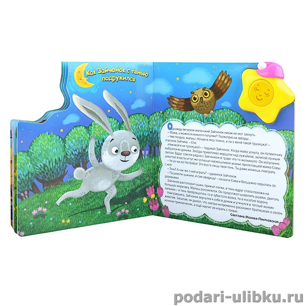 Нажимаете на кнопочку-личико звёздочки и начинает звучать колыбельная песенки и загорается ночничок, нажимаете еще раз и песенка перестаёт звучать, а ночничок гаснет. На картонных страничках с цветными иллюстрациями подобраны 4 сказки, которые родители смогут прочесть своим детям перед сном.