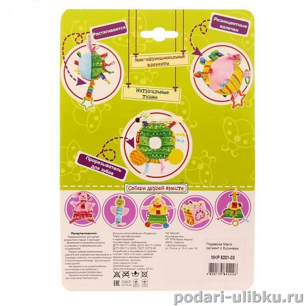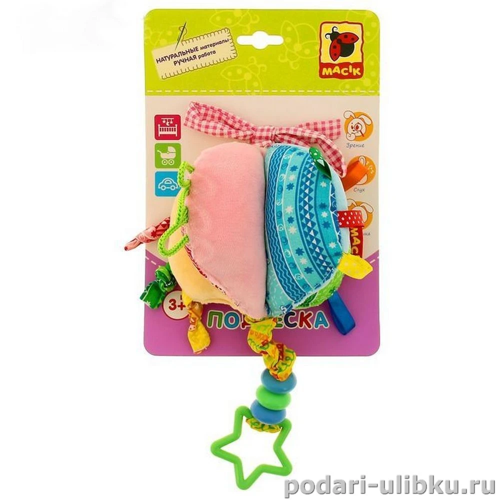 Подвеску можно закрепить в кроватке, коляске, детском манеже или автокресле. Для этого необходимо просто завязать тесёмки. Игрушка выполнена из мягкой ткани, изделие подходит для машинной стирки.