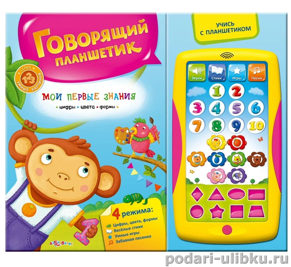 Говорящий планшетик "Мои первые знания. Цифры, цвета, формы" от Азбукварик сочетает в себе традиционную книгу и современные гаджеты. На страничках книжки малыш познакомится с цифрами, цветами и формами.