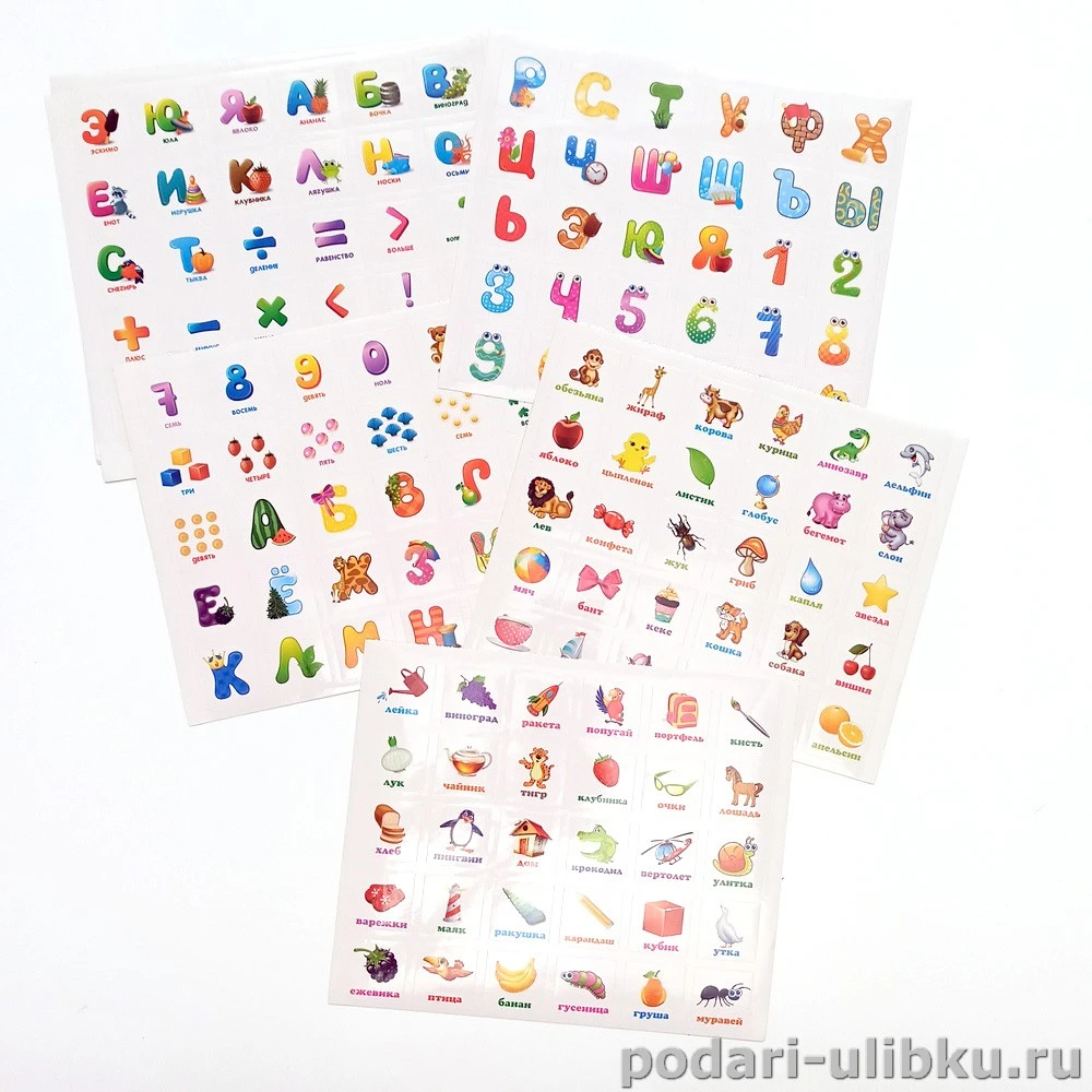 В комплекте 6 листов с наклейками и на детали конструктора можно по желанию наклеить разные картинки. В наклейках есть буквы, цифры, математические знаки, животные и разные другие интересные изображения.