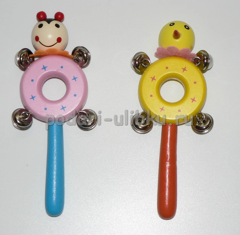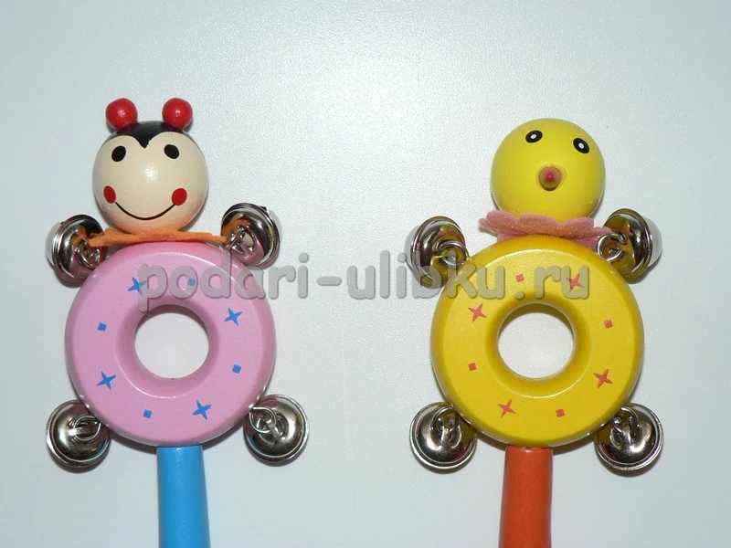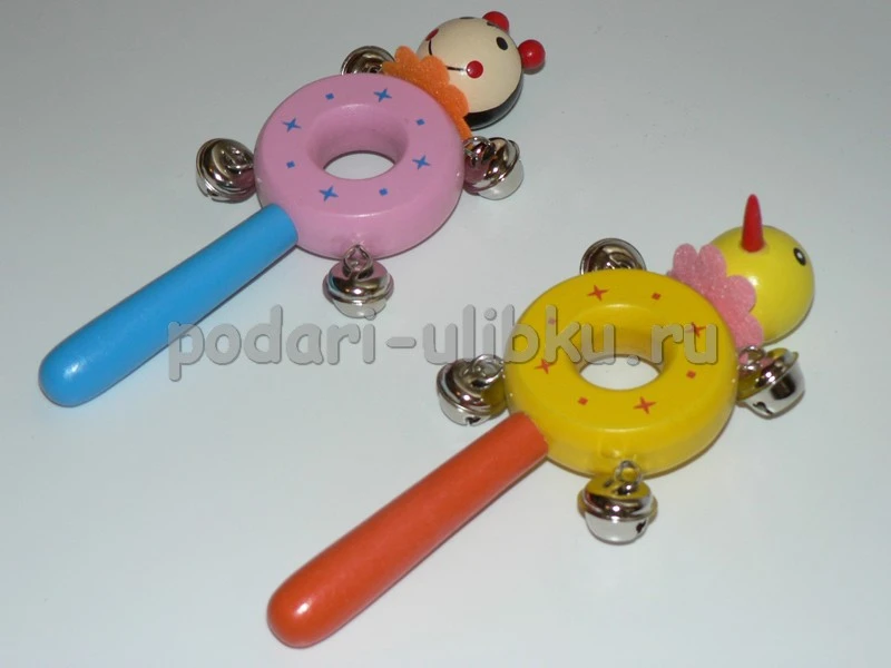 Игрушка выполнена в виде забавных персонажей, с удобной ручкой и четырьмя бубенчиками. Приятный перезвон понравится малышу.