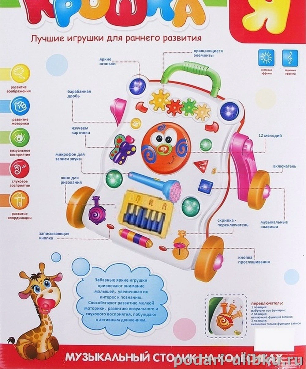 Это не просто игрушка! Это ходунок, который превращается в многофункциональный, музыкальный, развивающий столик. Ребенок сможет возить его везде где только захочет, а в помощь родителям малыша у ходунка есть удобная ручка для переноски игрушки. Можно ходить и играть дома и на улице, а если малыш устанет, он может сесть и поиграть. Ведь это не просто игрушка, это целый сундук интересных, увлекательных игрушек для комплексного развития малыша: