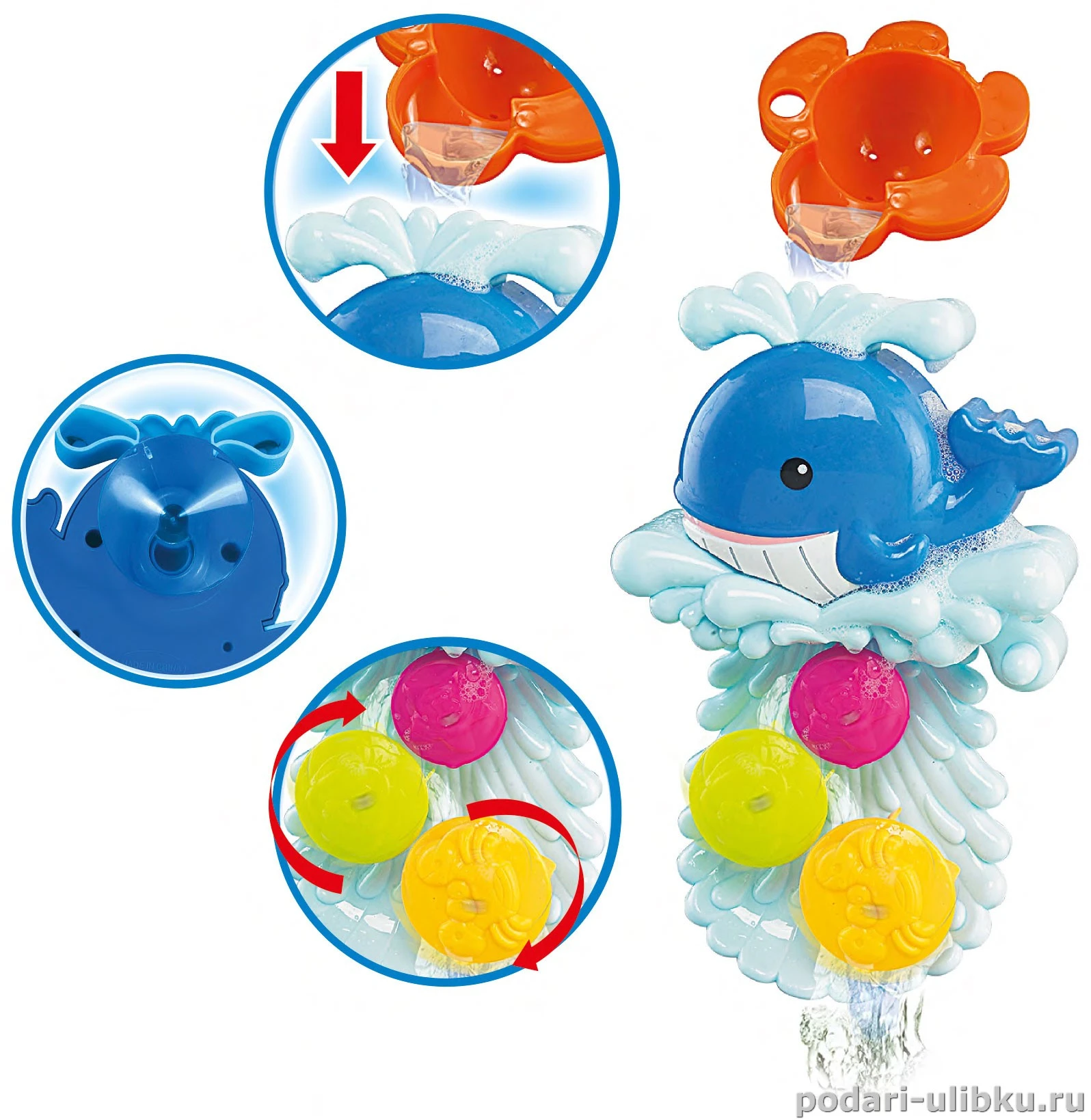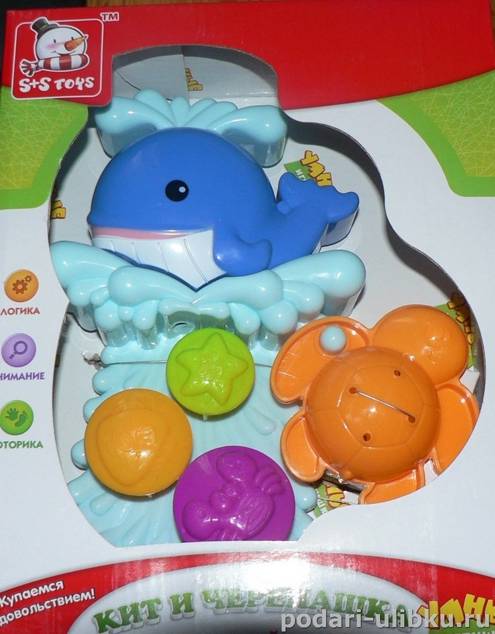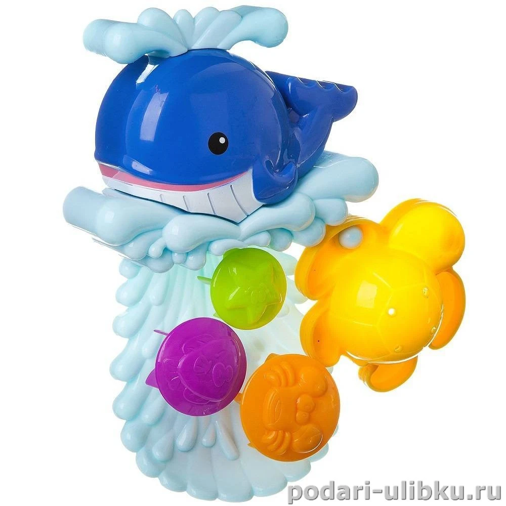 Игрушку - мельнице "Кит и черепашка" можно прикрепить к ванне, кафелю, душевой кабинке специальными большими присосками. Воду на мельницу можно наливать любой ёмкостью или специальным ковшиком в виде черепашки (которая входит в комплект) и смотреть как сбегает вода, приводя в движение разноцветные колёсики с животными. Чтобы черепашка не потерялась она может крепиться к мельнице.