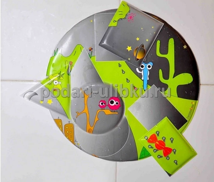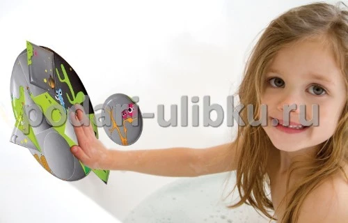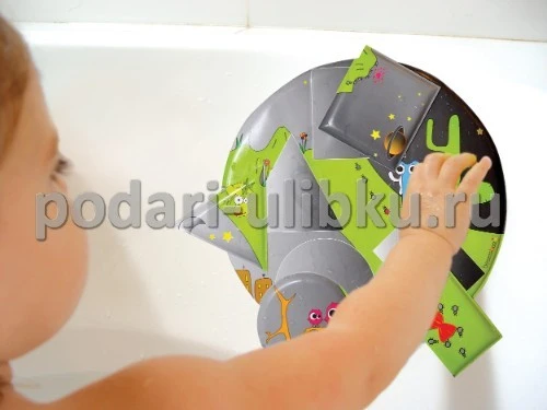 Игровое поле пазла выполнено в форме круга, которое при намокании легко крепится к плитке, ванне или душевой кабине. На игровом поле ребенок должен правильно разместить четыре геометрические фигурки пазла, чтобы получилась красивая картинка. Все фигурки крепятся к игровому полю также при намокании. Во время игры ребенок запоминает виды геометрических фигур, развивает моторику рук, цветовое восприятие, мышление и фантазию. Все картинки сделаны в виде небольших фигурок, которые прекрасно поместятся в детской ладошке. Швы мягкие, ровные. При изготовлении использовался качественный и нетоксичный для детской кожи материал.