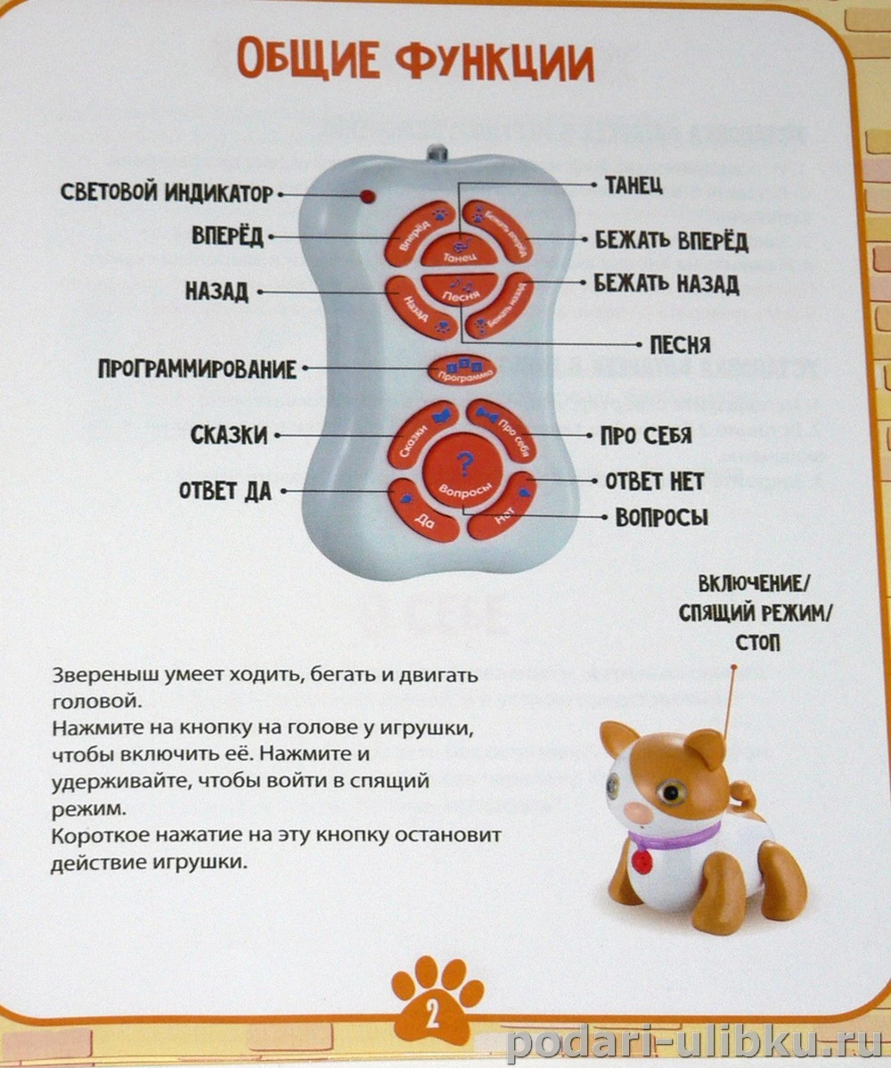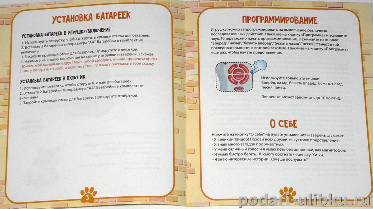 Звереныш умеет ходить, бегать и двигать головой. Игрушку можно запрограммировать на выполнения различных последовательных действий. Зверёныш может запомнить до 10 команд и радовать малыша долгим представлением.