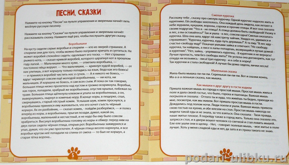 Нажав на пульте кнопку "О себе" звереныш расскажет малышу что умеет и любит. Нажмите на кнопку "Песни" на пульте управления и зверёныш начнёт петь песню, а нажав кнопку "Сказки" малыш услышит сказку. Нажмите еще раз, чтобы послушать другую сказку.
