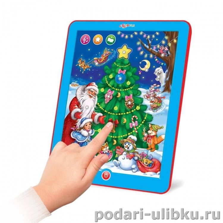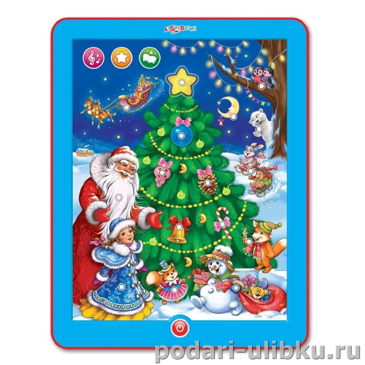 Нажимая на картинки малыш услышит поздравления от Деда Мороза и Снегурочки, волшебные звуки и мелодии, сказки, стихи и загадки и это всё в одном планшетике. С такой игрушкой ребенку никогда не будет скучно!