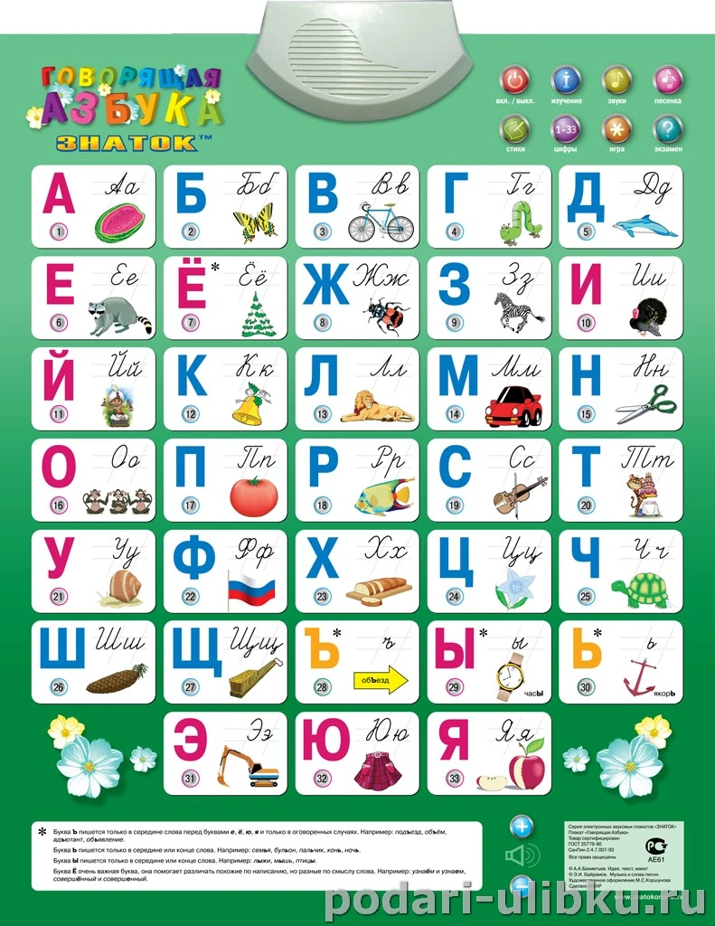 Электронный звуковой плакат ЗНАТОК "Говорящая азбука" вобрал в себя все пожелания родителей и педагогов и представляет собой расширенный вариант говорящей азбуки.