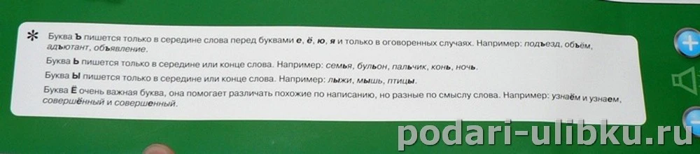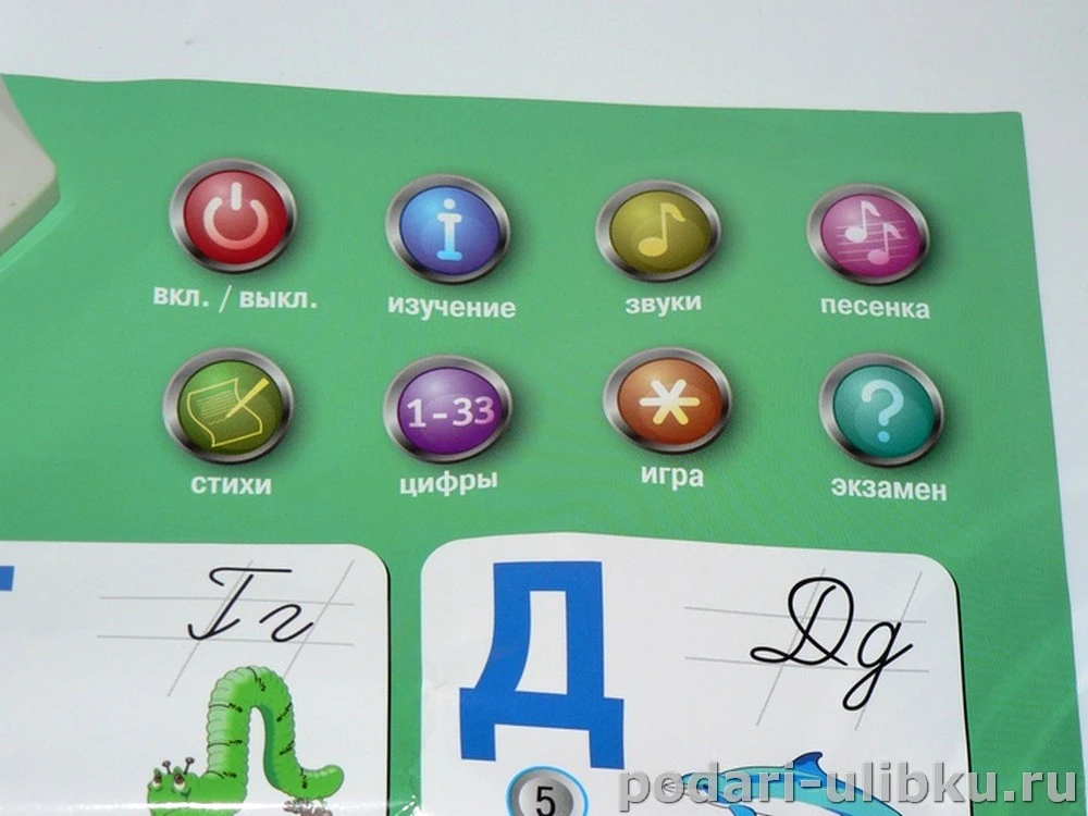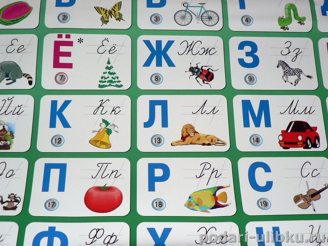 Главным образом он предназначен для детей, которые только начинают изучать русский алфавит. На большом и красочном плакате изображены буквы, картинки к каждой из них и кнопочки, на которых указан порядковый номер соответствующей буквы алфавита.