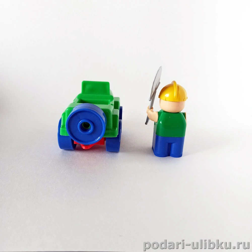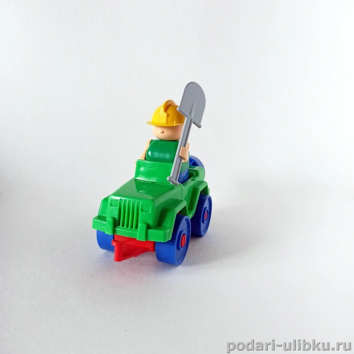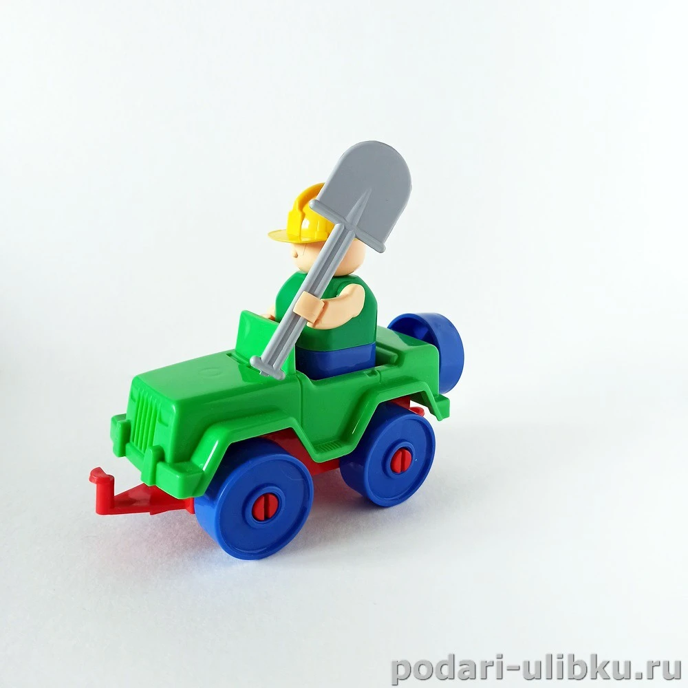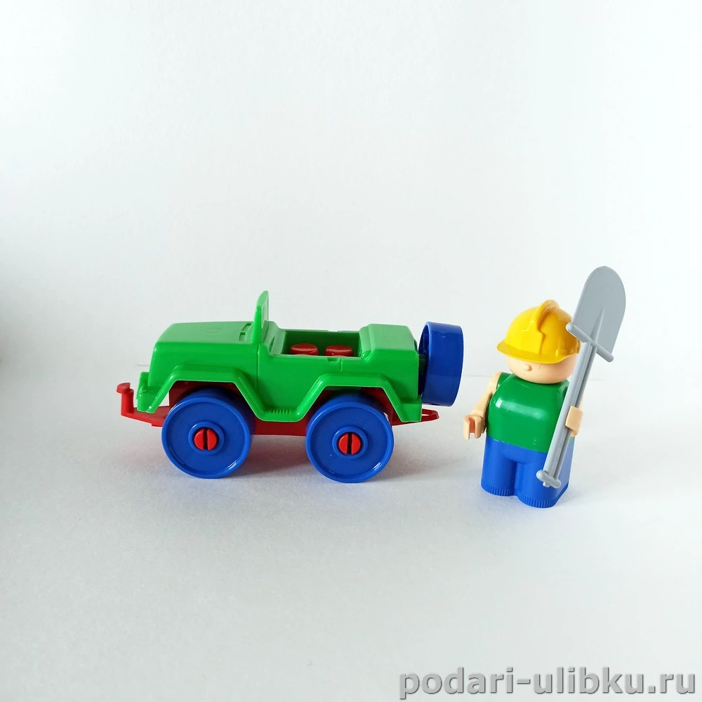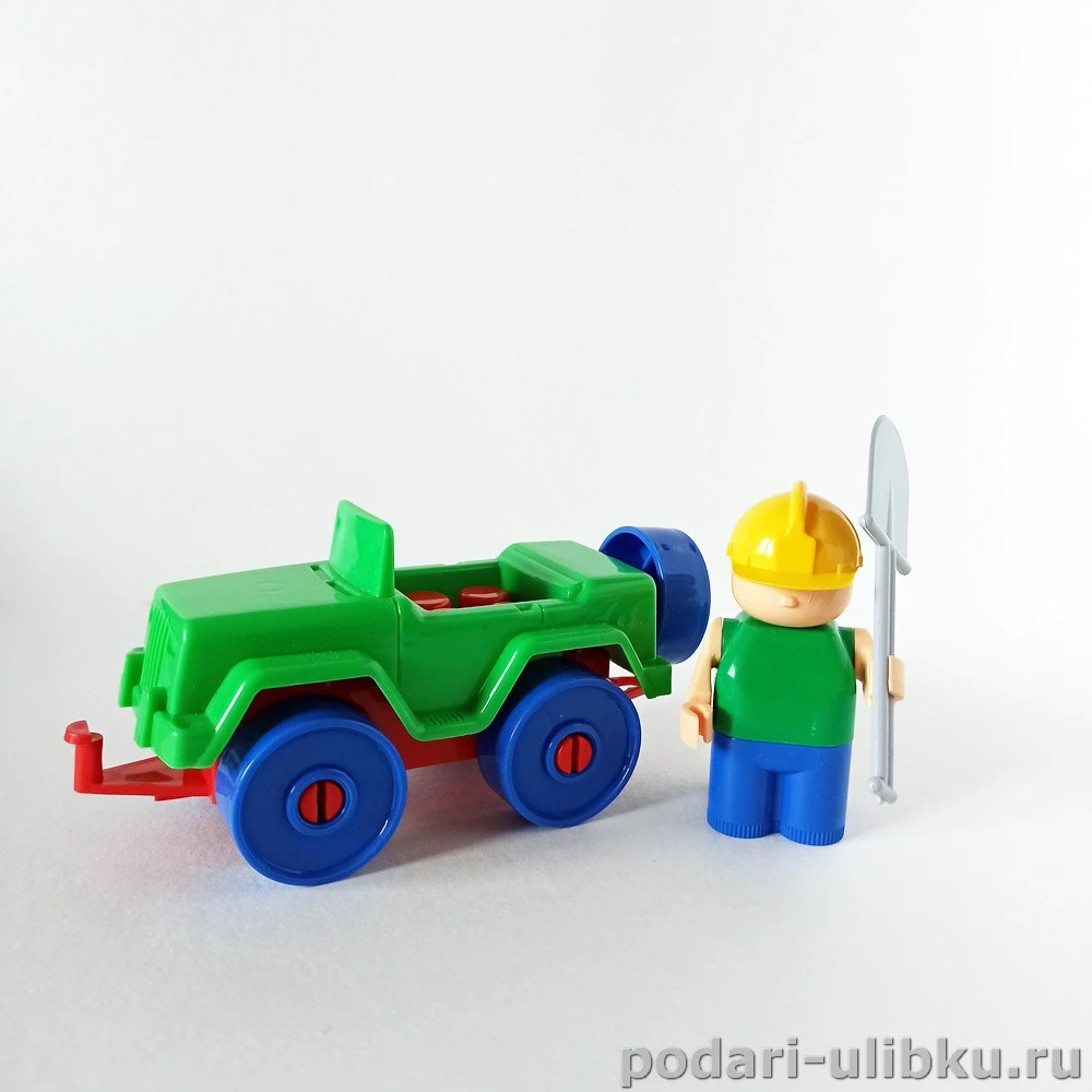 В комплекте: детали для создания машины-джипа, водителя, лопата.