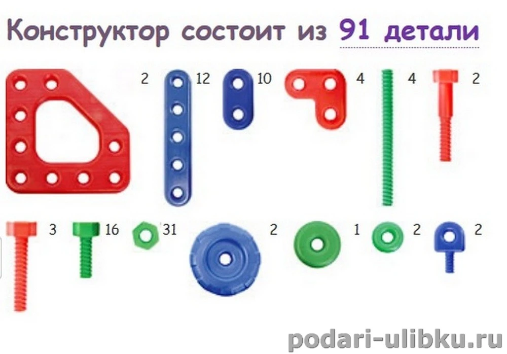 В комплекте: 91 деталь конструктора + 2 гаечных ключа для сборки.