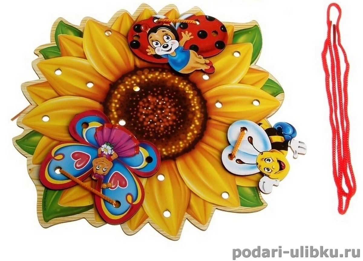 Игра - шнуровка "На подсолнухе" станет полезным и интересным подарком для малыша. Весёлые насекомые на шикарном подсолнухе понравятся малышу и займут достойное место среди его игрушек.