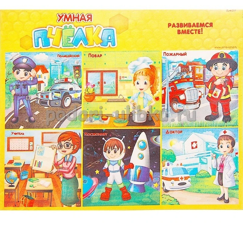 В комплекте: 9 разноцветных кубиков с изображением шести известных профессий и карточка с готовыми изображениями.