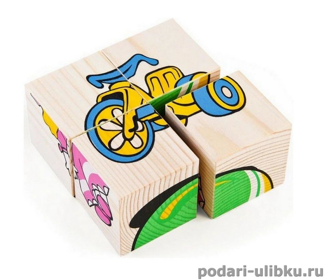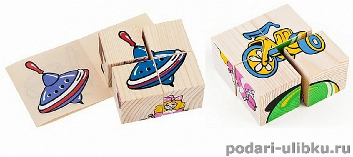Ребёнок будет с увлечением играть с кубиками, собирать и рассматривать картинки. С помощью 4-х кубиков малыш соберёт: велосипед, куклу, юлу, мячик, мишку и ведёрко с совочком для игры в песке. А родители могут придумать ребёнку разные игры и истории и просто дать сравнить игрушки в реальности с картинками на кубиках.