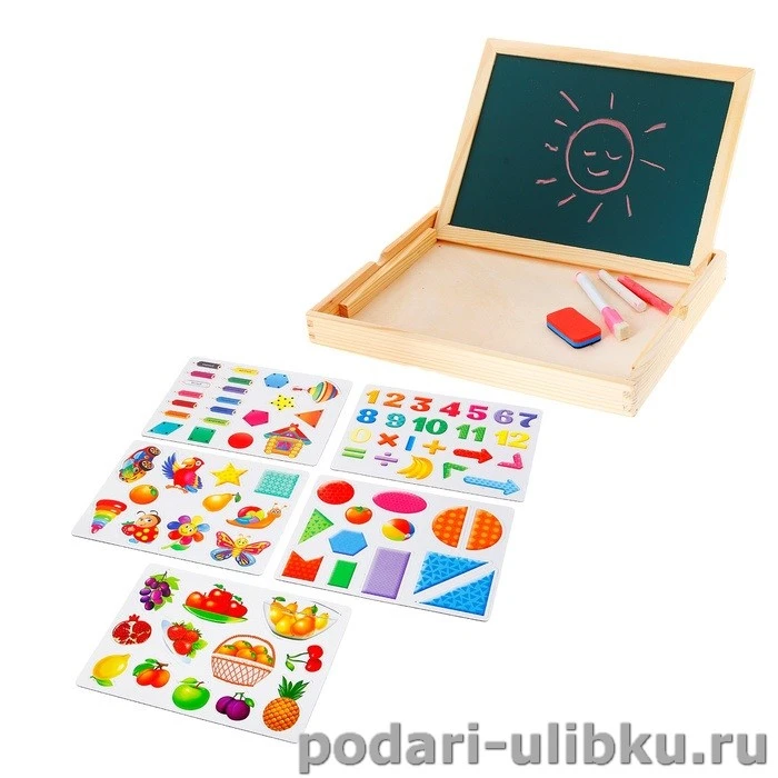 Двухсторонняя доска – прекрасное средств развития творческих способностей, моторики, воображения, цветового восприятия и обучения ребятишек любого возраста. Магнитный конструктор "Цифры" поможет малышу не только выучить цифры, цвета, фигуры, фрукты но и поиграть в весёлые игры.