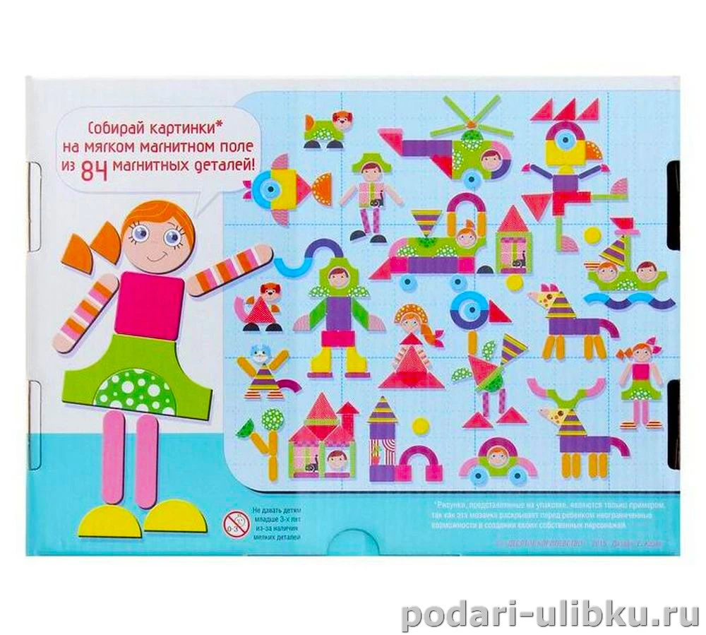 Малыш может собрать на мягком магнитном поле великое множество фигур, используя 84 магнитные детали. На обратной стороне упаковке, малыш найдет интересные и яркие варианты для сборки, которые являются только примером, ведь эта игра раскрывает перед ребёнком неограниченные возможности по созданию собственных персонажей.