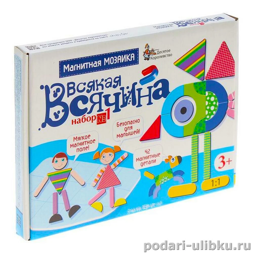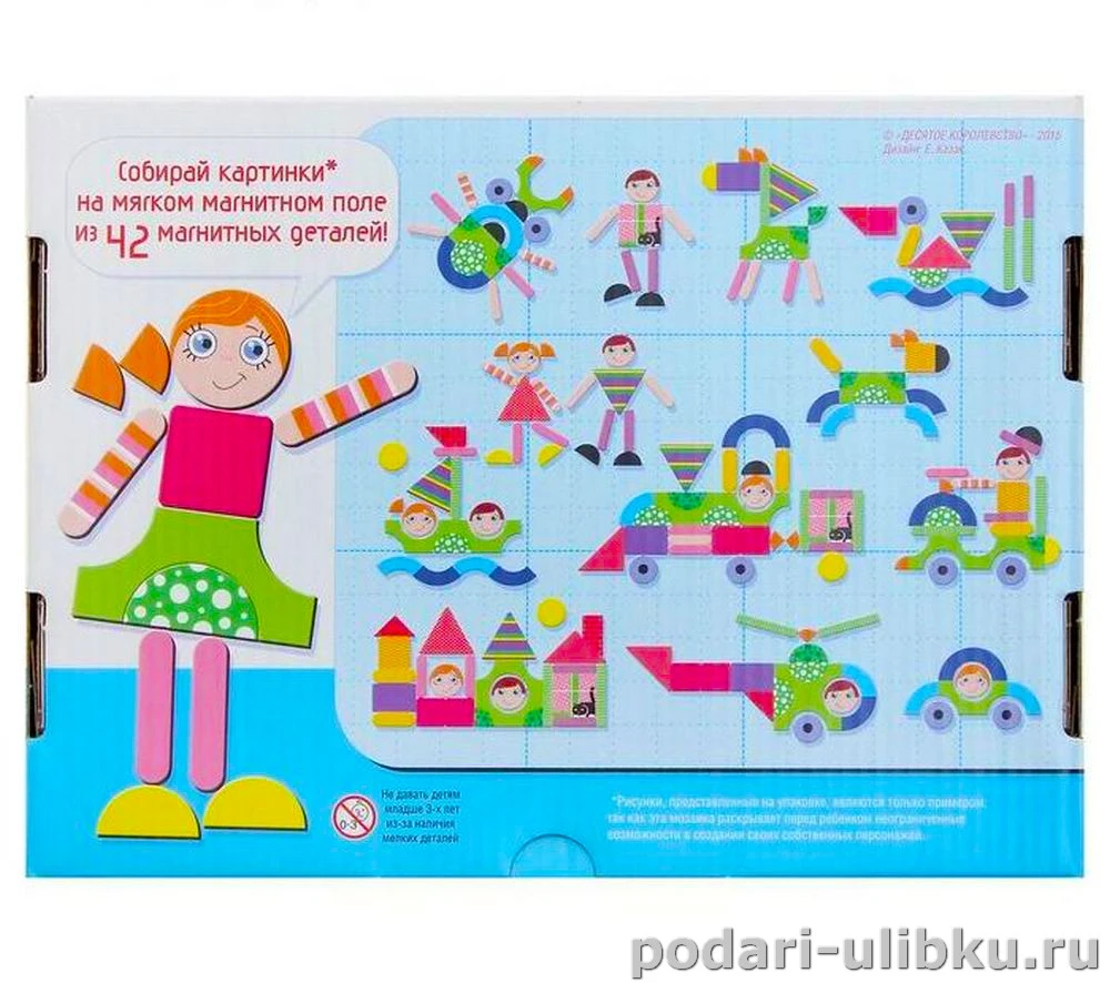 Ребёнок может собрать на мягком магнитном поле большое количество фигур, используя 42 магнитные детали. А для примера, на обратной стороне упаковке, можно найти интересные и яркие варианты для сборки и они подтолкнут фантазию малыша к созданию собственных картинок.