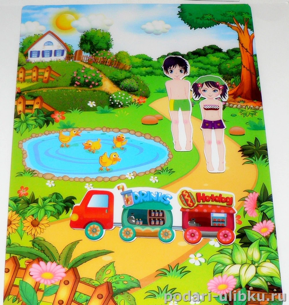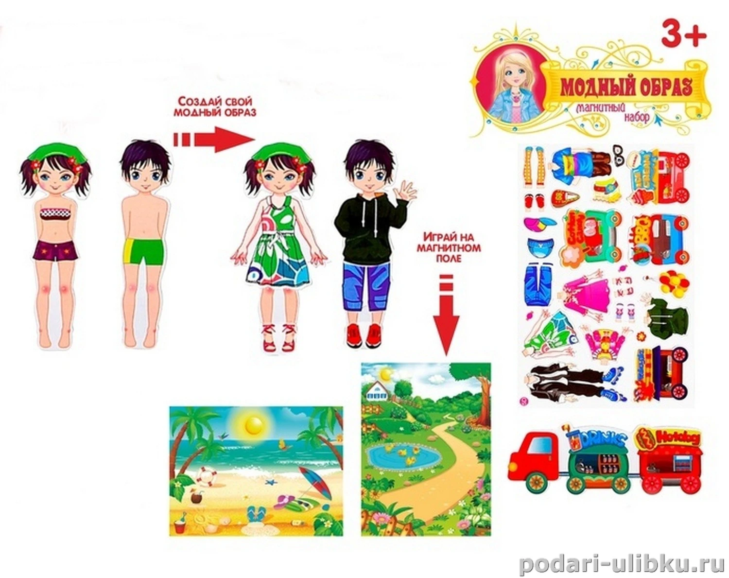 В наборе: поле магнитное двухстороннее, 2 фигурки - мальчик и девочка, автомобиль с двумя прицепами и 1 лист с одёжкой , аксессуарами и 4 вагончика-прицепа для автомобиля.