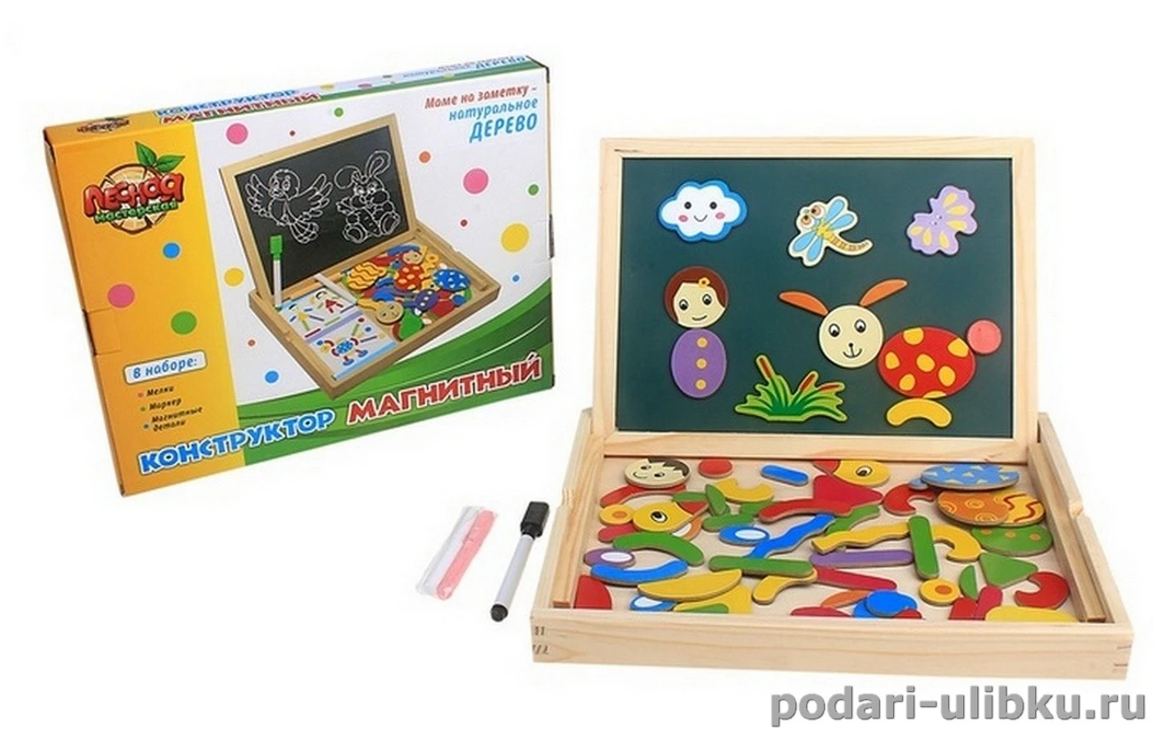 Конструктор представляет собой двустороннюю чертежную доску, с одной стороны она черная для рисования мелками, а с другой стороны белая на ней можно рисовать маркером и крепить магнитные элементы.