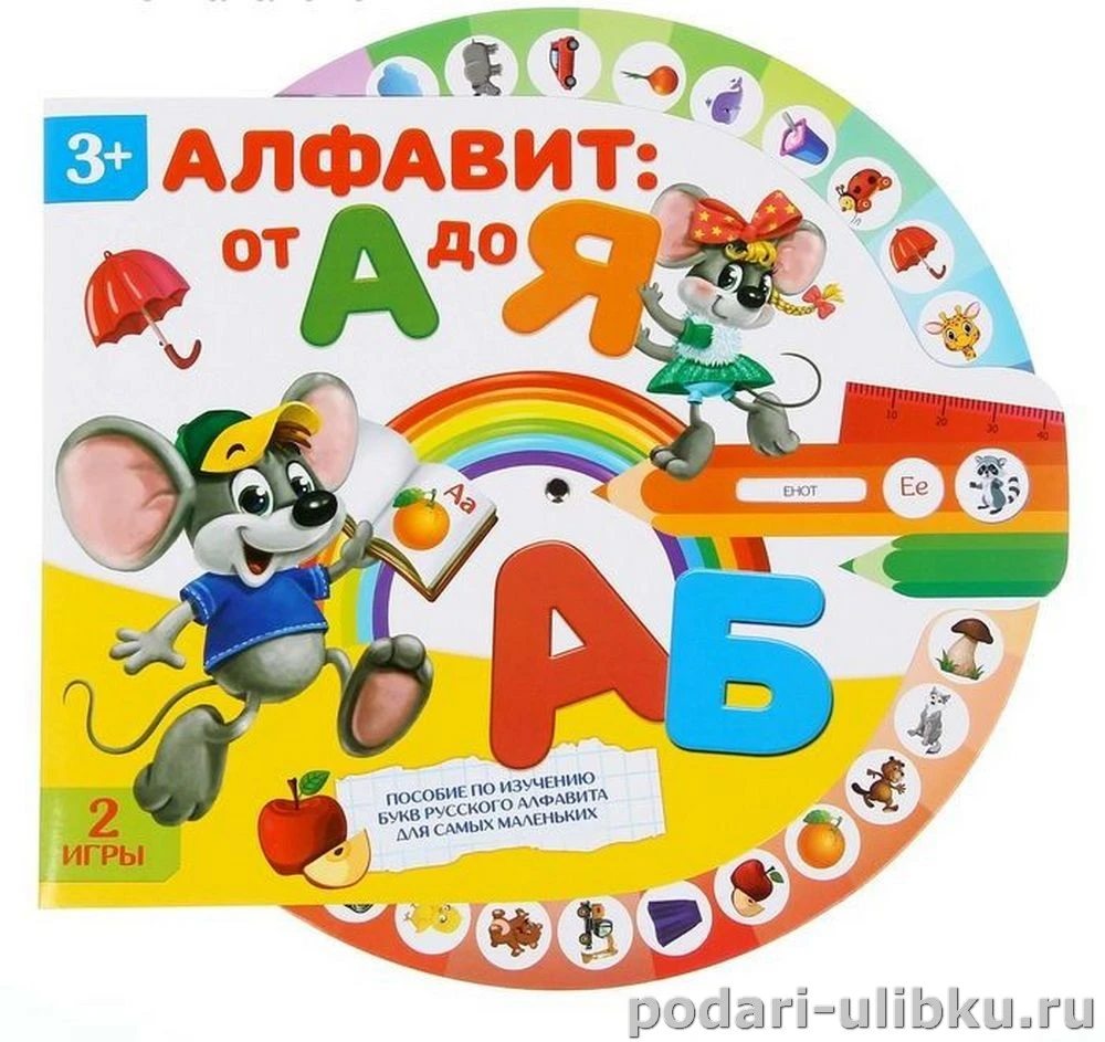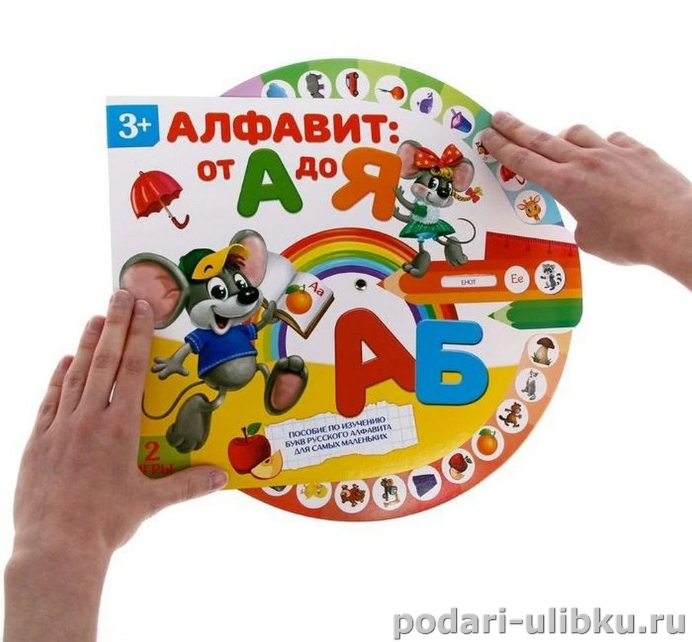 Крутите колесо и знакомьтесь с буквами. Рядом с каждой расположен сектор, в котором написано слово и есть красочная картинка. Так малыш не только выучит азбуку, но и расширит словарный запас!