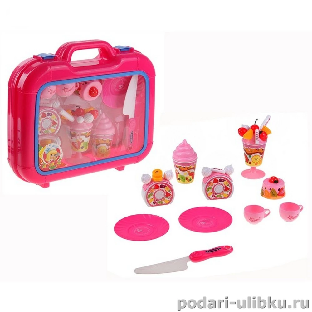 Сладкий набор с сладкоежка включает себя посуду и десерты. Кусочка кексика можно разрезать пластиковым ножом из набора, а мороженое украсить дольками клубники апельсина или вафлями. Всё это вкуснота упаковано в прочной чемоданчик, позволит юному шеф-повару с собой везде и в гости и в поездку на улицу.