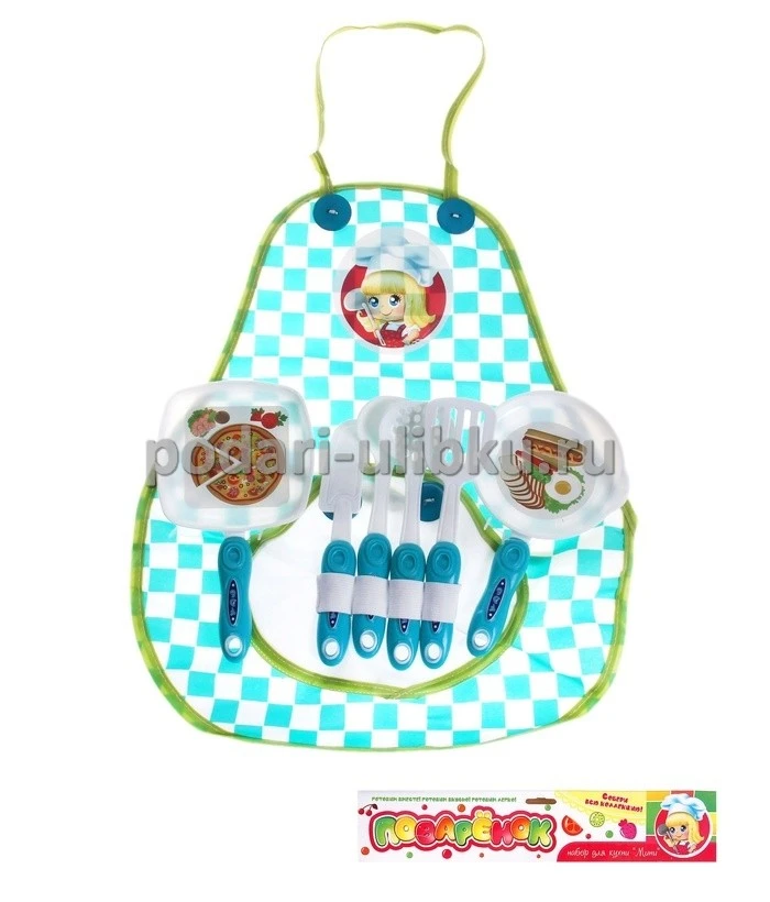 В комплекте: фартук, 2 сковородки и 4 кухонных прибора для приготовления еды.