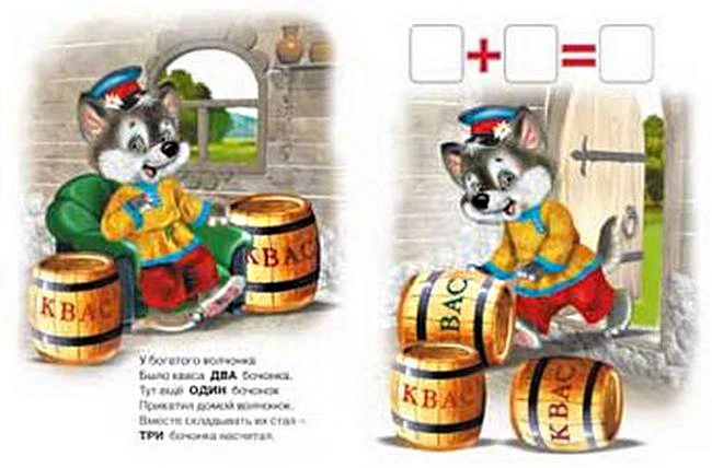 На каждом развороте учебника ребенок найдет интересных персонажей и забавный стих. Из стиха подсказки малыш сможет сложить пример и решить его в весёлой игровой форме. Для этого просто нужно наклеить нужные цифры в пустые квадратики чтобы получился правильный пример и его решение и для этого в учебнике есть наклейки с цифрами.