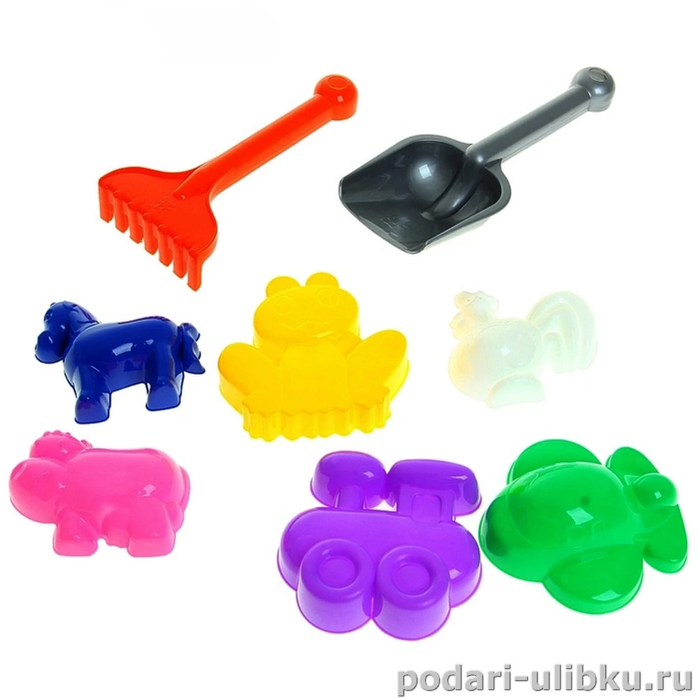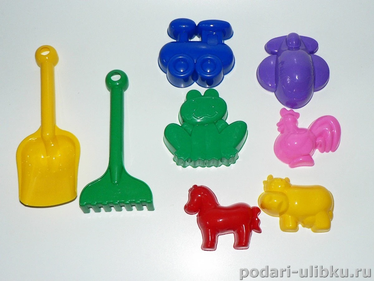 В наборе: совочек, грабли и 6 формочек.