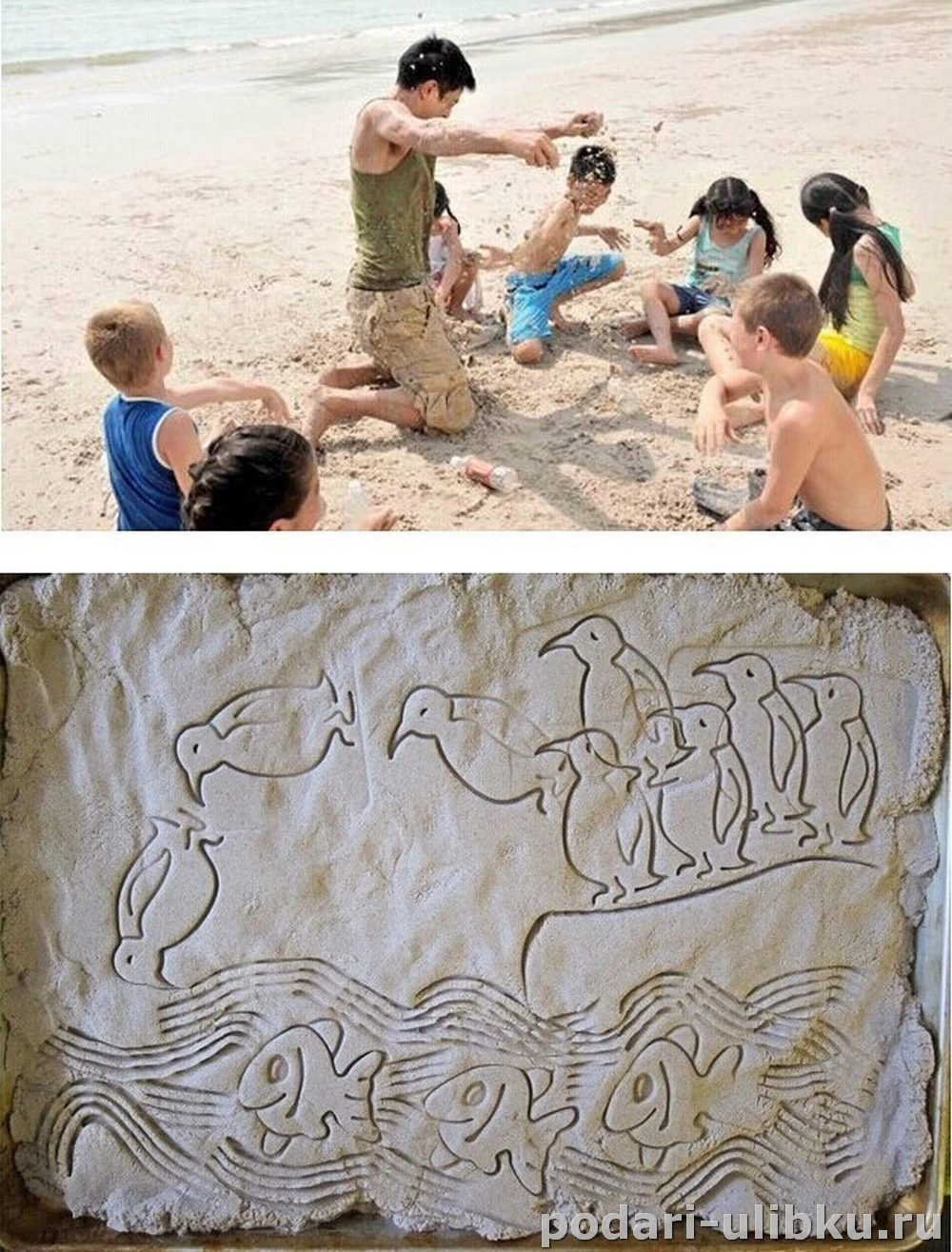 Штампы могут использовать как взрослые так и дети. Даже годовалый малыш сможет оставлять оттиск па песке и радоваться получившемуся результату.