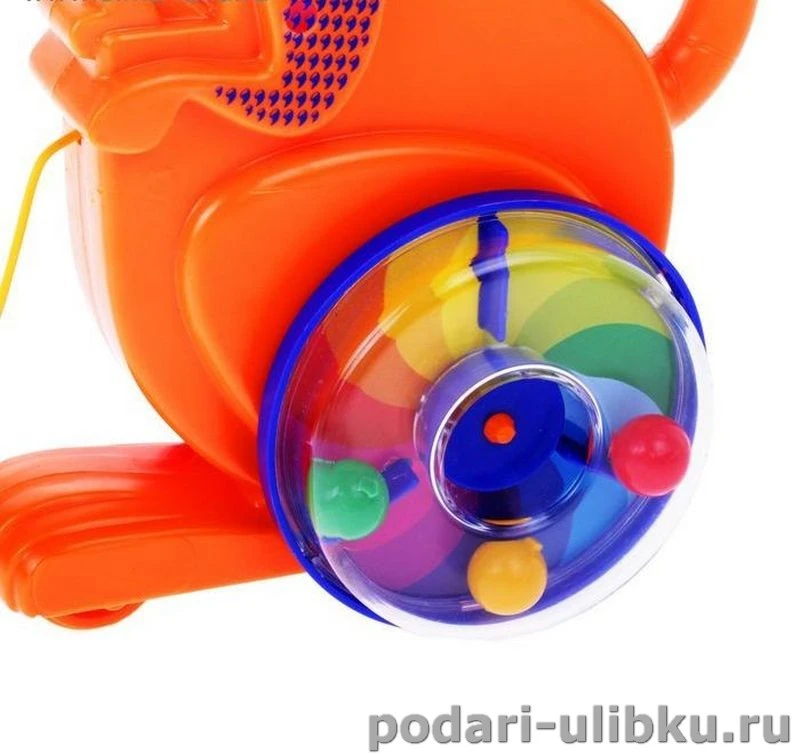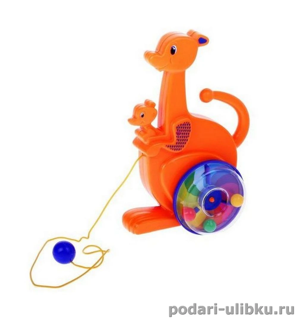 Забавная яркая каталка в виде улыбчивой мамы кенгуру с милым малышом несомненно понравится малышу. Он сможет катать каталку и дома и на улице. У каталки предусмотрена длинная верёвочка с шариком на конце, а еще у неё огромные колеса, в которых прыгают и постукивают три разноцветных шарика.