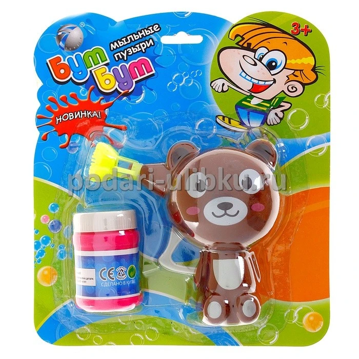 Комплект: флакон мыльного раствора, пистолет для выдувания пузырей в виде бурого мишки