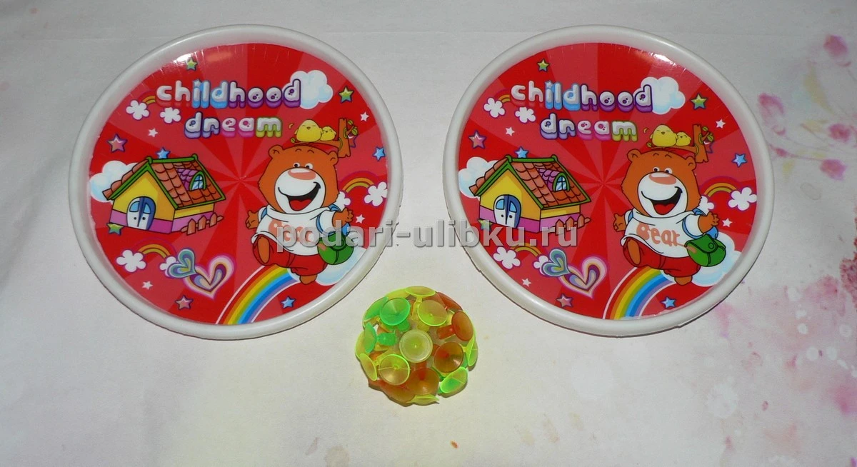 Любопытная игрушка для малыше и взрослый. Две тарелки выполняют роль ракеток, необычный мяч-липучка любопытен сам по себе, а еще он круто клеится к тарелочкам.