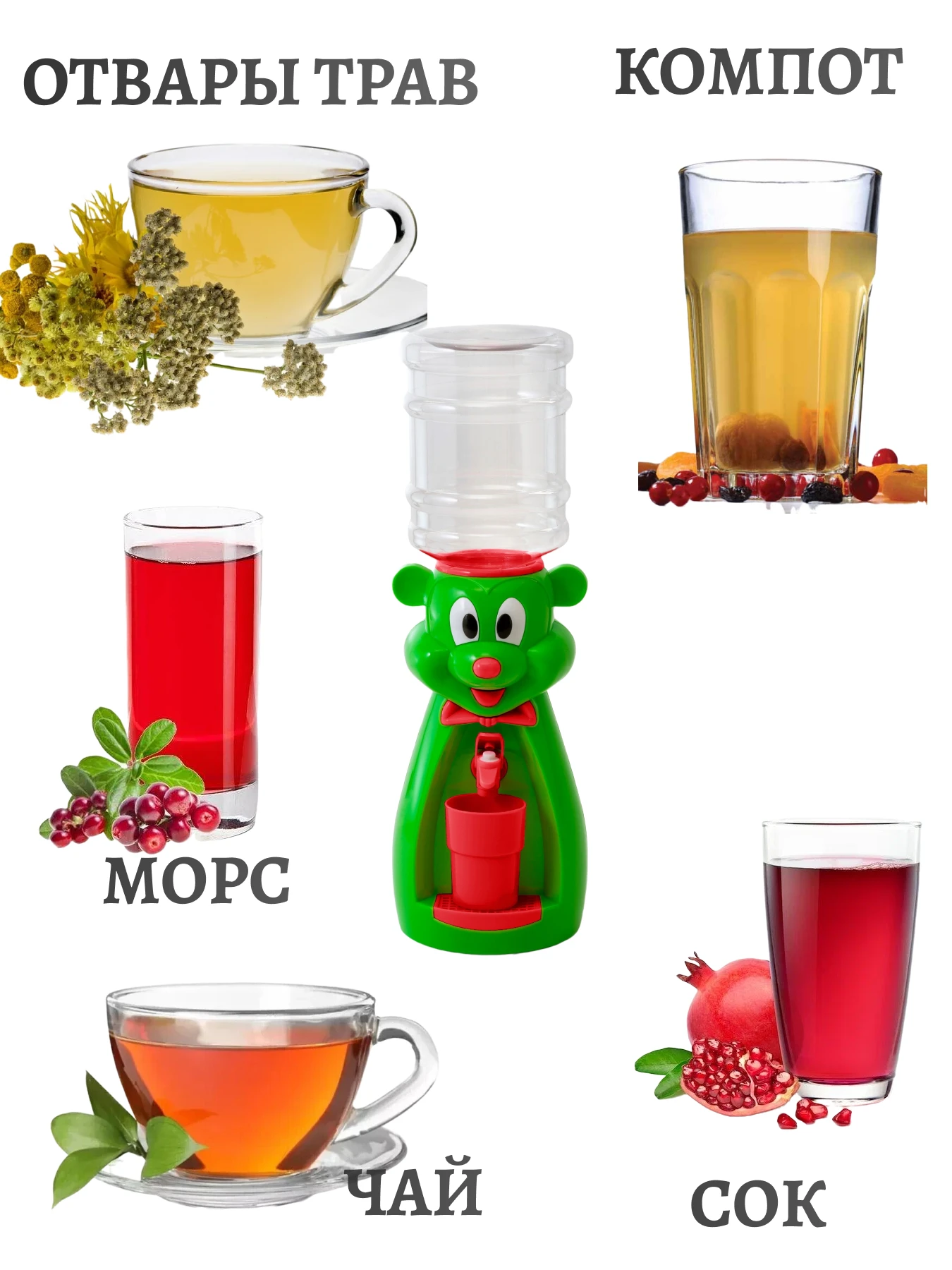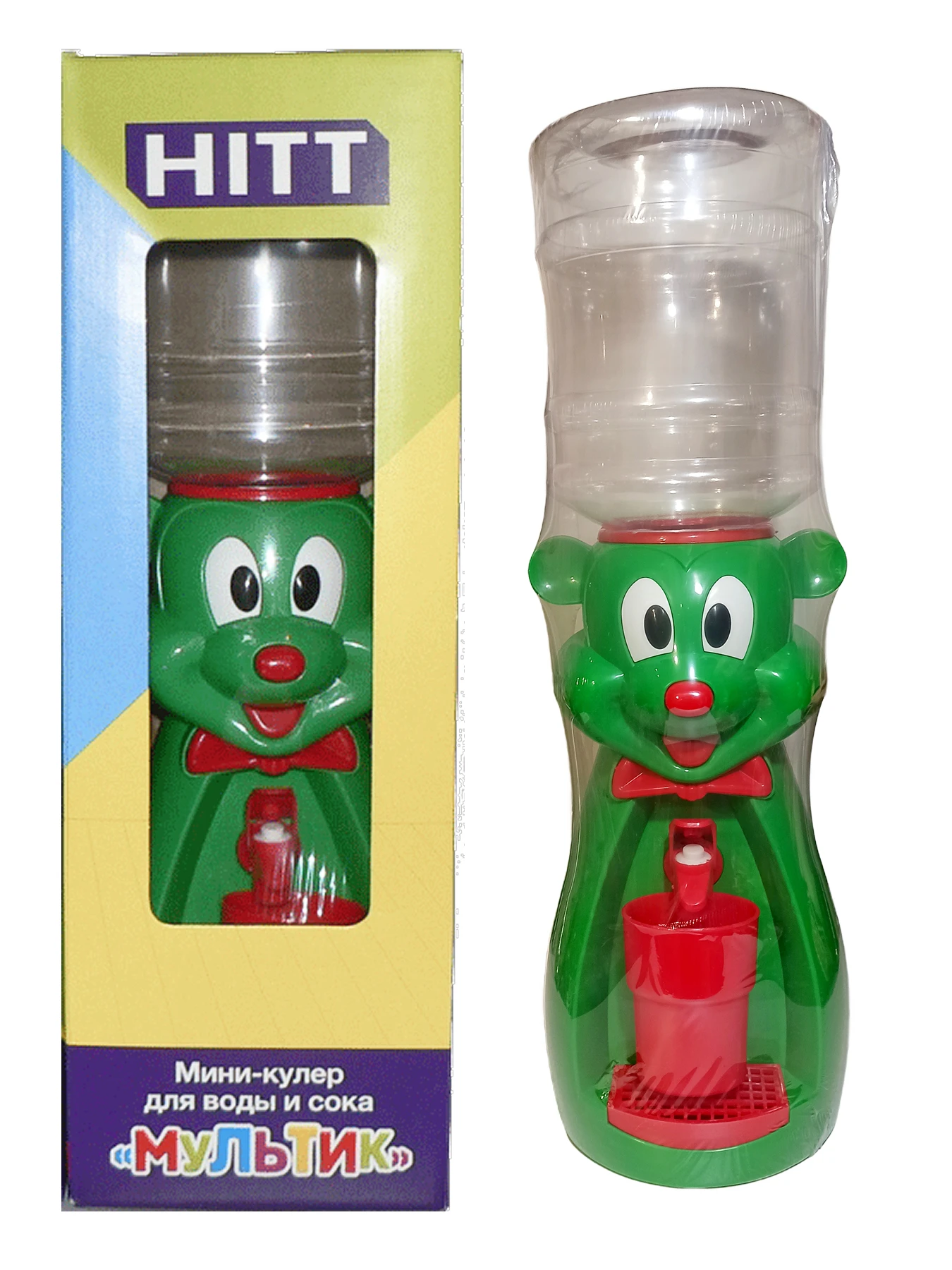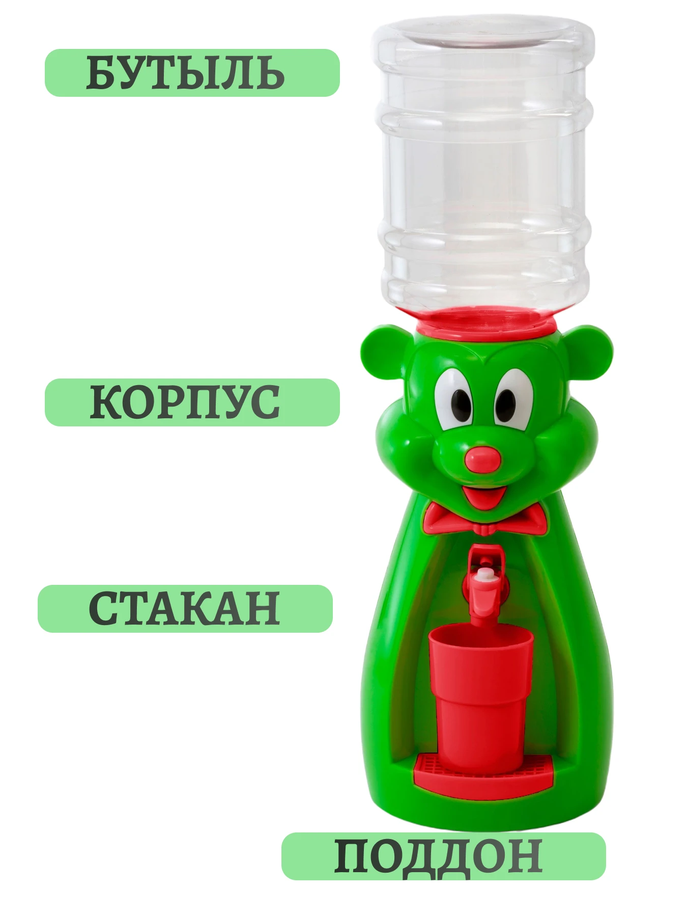 Детский кулер состоит из пластикового корпуса яркой расцветки, выполненного в виде милого, улыбчивого красного мышонка и оснащённого краном со специальным клапаном. Краник кулера нажимается легко. Также в состав устройства входит небольшой съемный поддон, исключающий протекание жидкости на стол. Вода находится в закрытой емкости, что исключает попадание в неё мелкого мусора или пыли. Краник кулера нажимается легко.