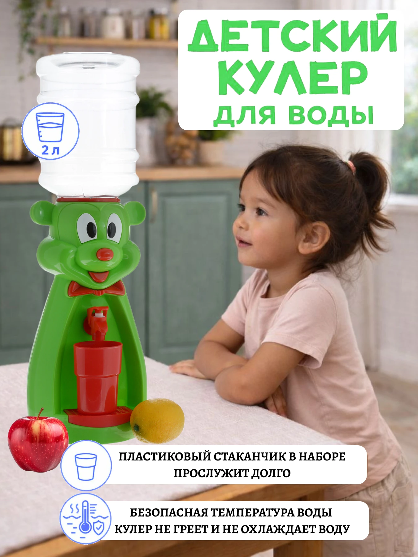Кулер не греет и не охлаждает воду, поэтому вы можете не переживать, что ребёнок обожжётся или простудит горло.