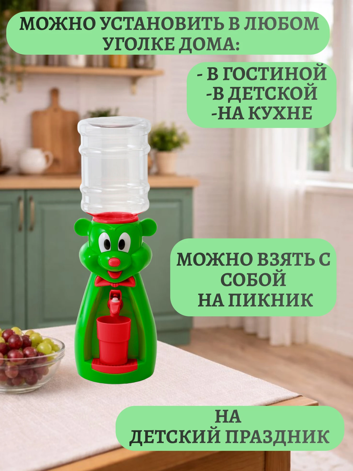 Милый кулер в форме милого улыбчивого мышонка привлекает внимание ребёнка и отлично вписывается в детскую комнату.