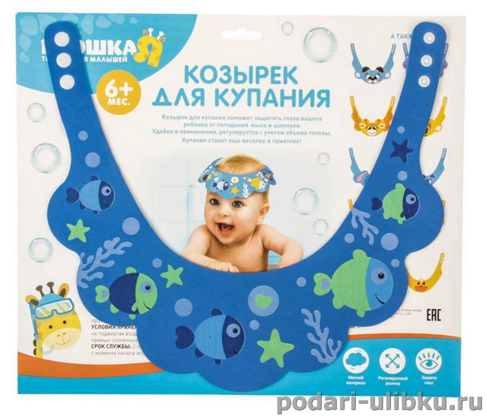 Универсальный размер позволяет использовать его для детей любого возраста. Обхват регулируется длинной липучкой. Козырек плотно облегает голову ребенка, не протекает и исключает попадание мыльной пены в глаза малыша и ушки.