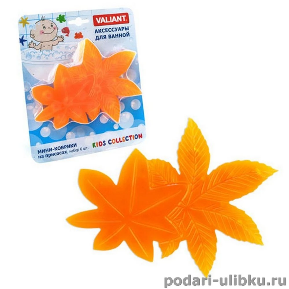 Мини-коврик для ванной Valiant Листочки - яркий, забавный аксессуар для ванной комнаты. Коврик Листочки прочно крепится на любую гладкую поверхность с помощью присосок и малыши очень любят переклеивать яркие картинки с места на место.