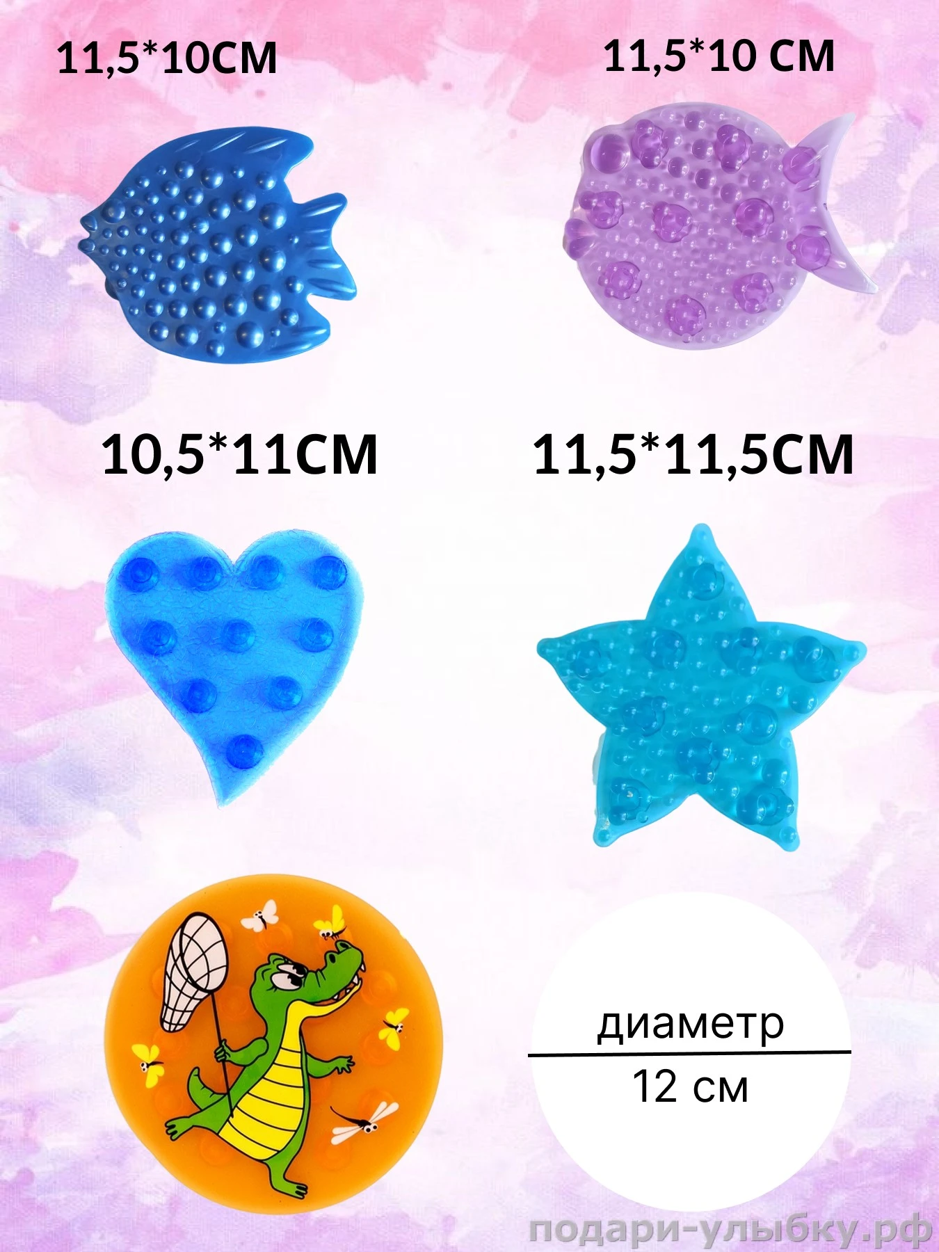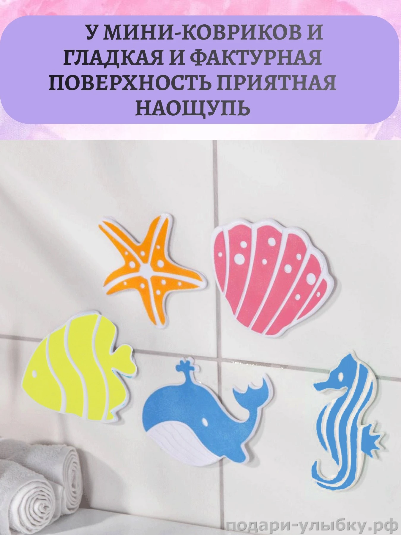 Превратите купание в увлекательное водное приключение! Изучайте цвета и персонажей в игровой форме! Придумайте про них истории, они обязательно понравятся малышу. Мини-коврики яркие и разноцветные с различными фактурами и приятны наощупь.