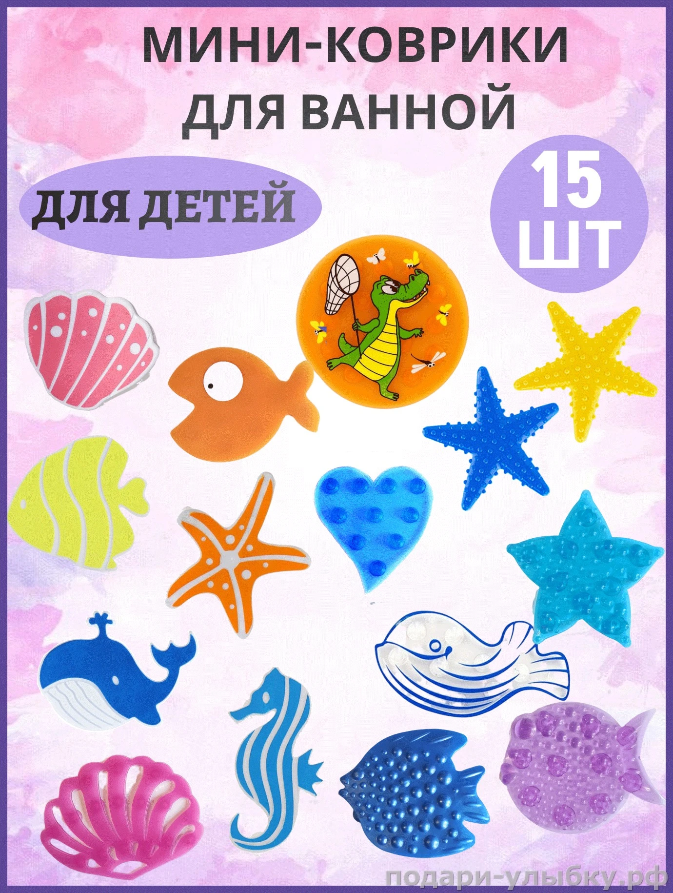 В наборе: 15 разных, ярких мини-ковриков с забавными персонажами, которые понравятся любому ребёнку. Гармонично подобранный набор, популярные персонажи. В наборе коврики: 4 морские звезды разные, 4 разные рыбки, кит, кашалот, сердечко, морской конёк, 2 ракушки, круглый коврик с крокодильчиком .