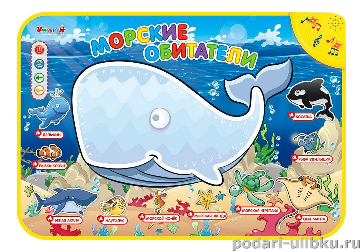 Музыкальный коврик "Морские обитатели" серии Умный Я - яркая обучающая игрушка, совмещающая в себе музыкальные, развивающие элементы и возможность рисовать и не испачкаться.