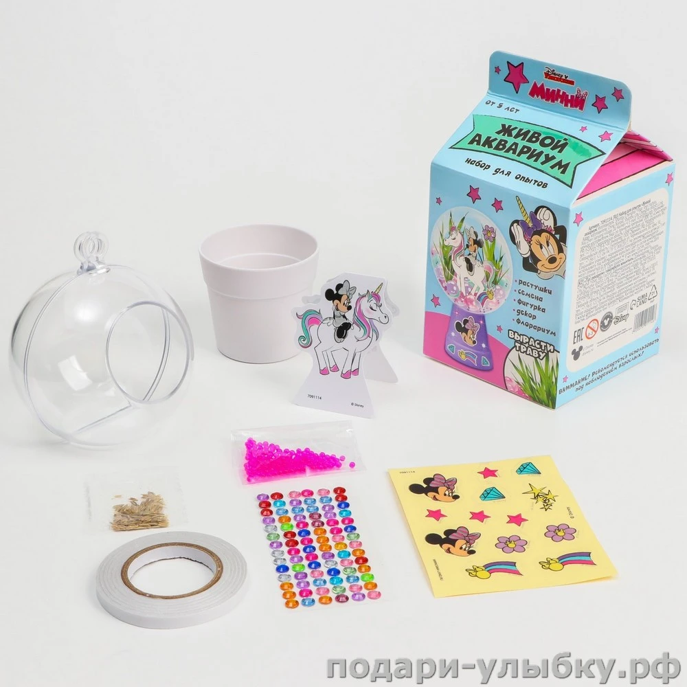 В наборе всё необходимое: аквариум и подставка; семена и гидрогелевые шарики; фигурка Минни Маус; декор, наклейки, стразы; двусторонний скотч.