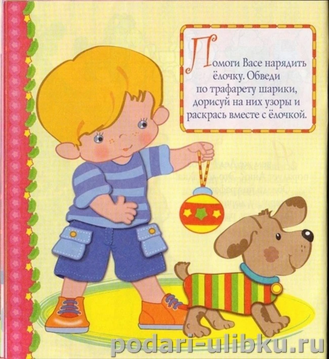 Шаблоны различных форм помогут решить задания, их малыш найдет на специальной вставке в середине книги. На каждой странице - веселая картинка для раскрашивания и задание, которое надо выполнить с помощью нужного шаблона. Нужно нарядить ёлочку или нарисовать для мальчка Жени подарок - пушистого зайку, или раскрасить используя трафарет новогодний наряд кошечки и еще много весёлых заданий.