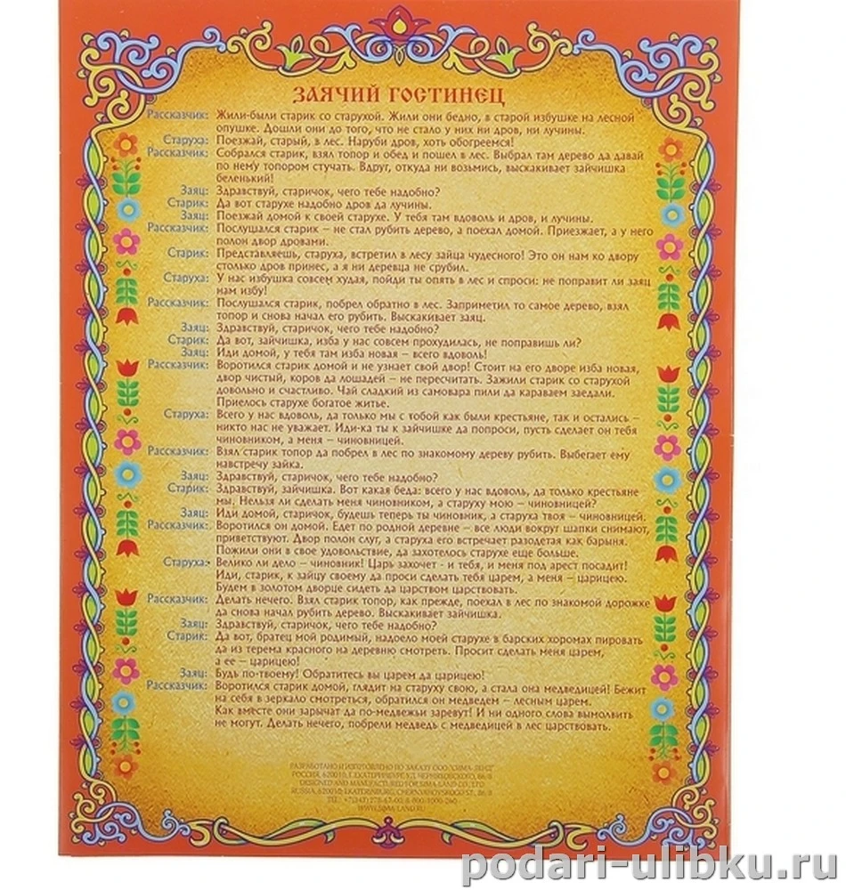 Внутри набора вы найдёте сценарии 4-х известных русских сказок и маски персонажей из них. Дети одни, или с родителями могут разыграть по ролям любую сказку, побывать в ней и получить море удовольствия.