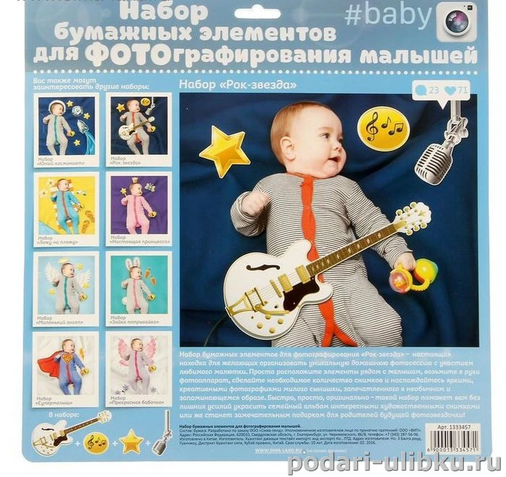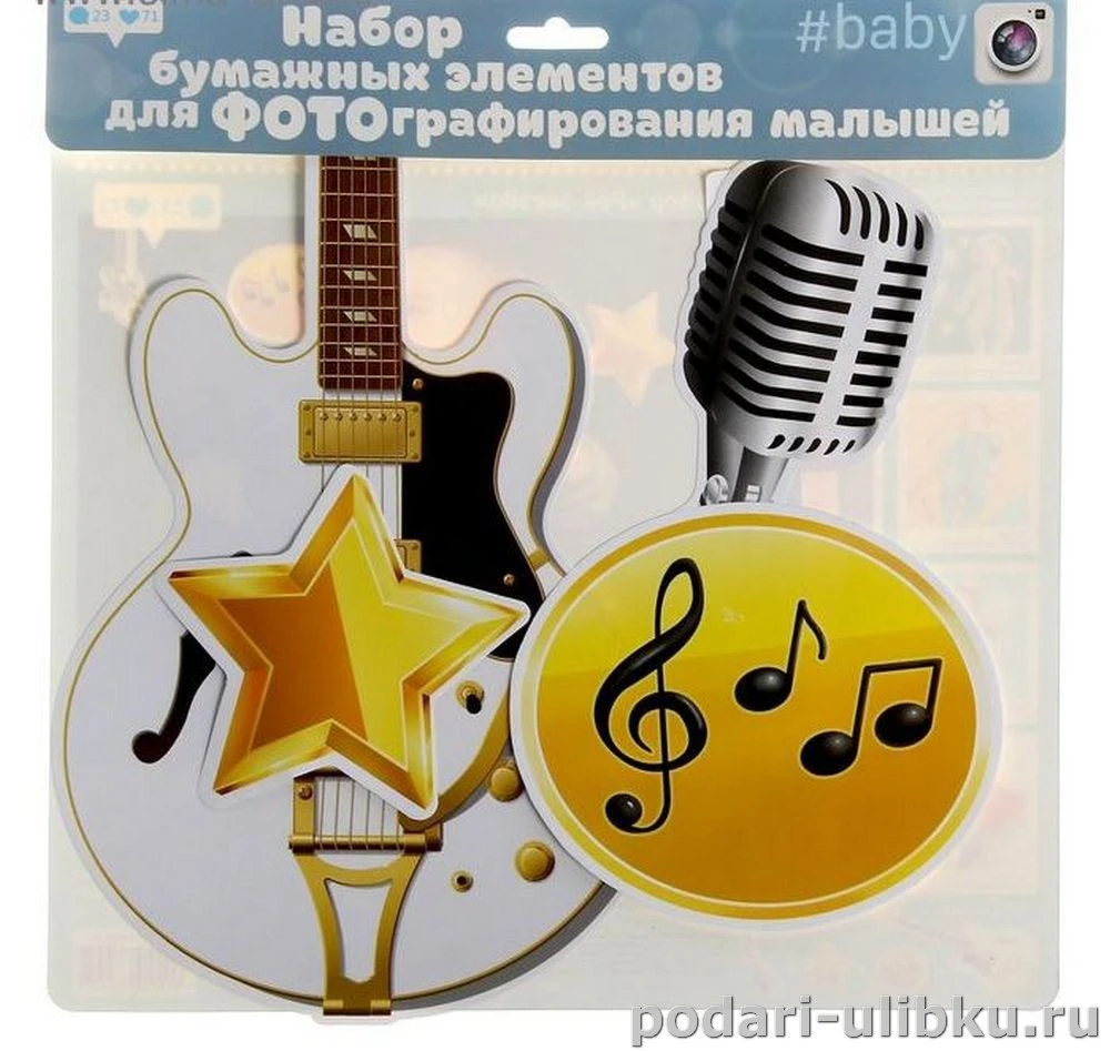 Набор бумажных элементов для детской фотосессии "Рок-звезда" - настоящая находка для желающих организовать уникальную домашнюю фотосессию с участием любимого малютки. Просто расположите элементы рядом с малышом, возьмите в руки фотоаппарат и сделайте оригинальные снимки!