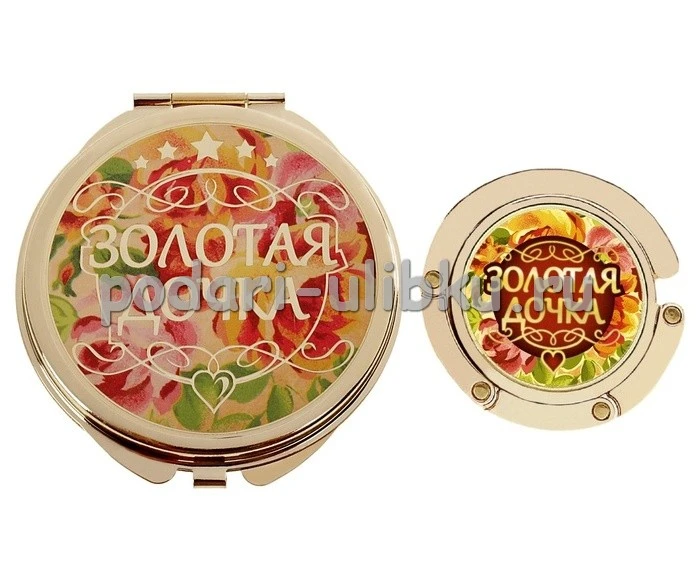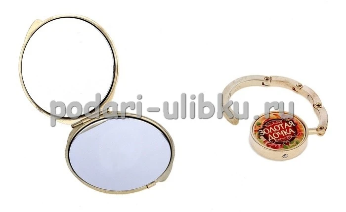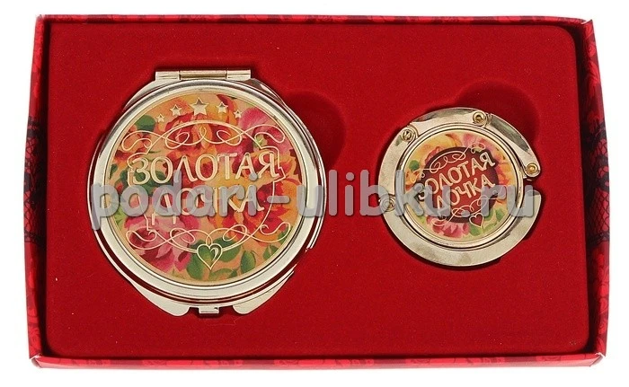 В подарочный набор входят: декоративное складное металлическое зеркало с цветной акриловой вставкой, защищающей от потускнения, и надежный металлический крючок для сумки с вкладышем из того же материала.
