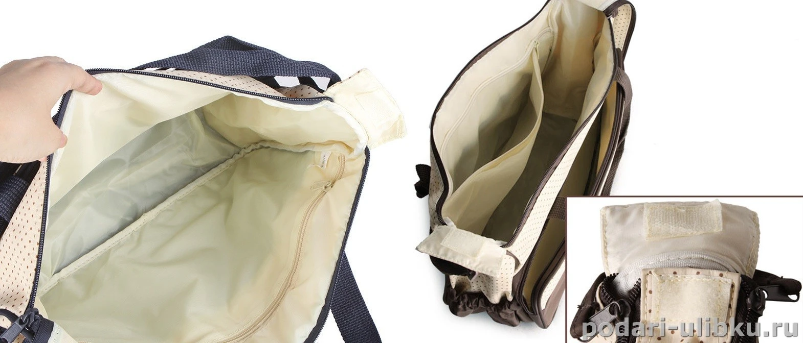 У обеих сумок внутри большое пространство, что позволить разместить там вкладыш органайзер или крупные вещи. У сумок двойная, удобно сделанная, молния с петельной, для простоты открывания и застегивания сумки. Ведь порой маме приходится делать это одной рукой, а тут потянув за петельку можно открыть и закрыть сумку очень просто.