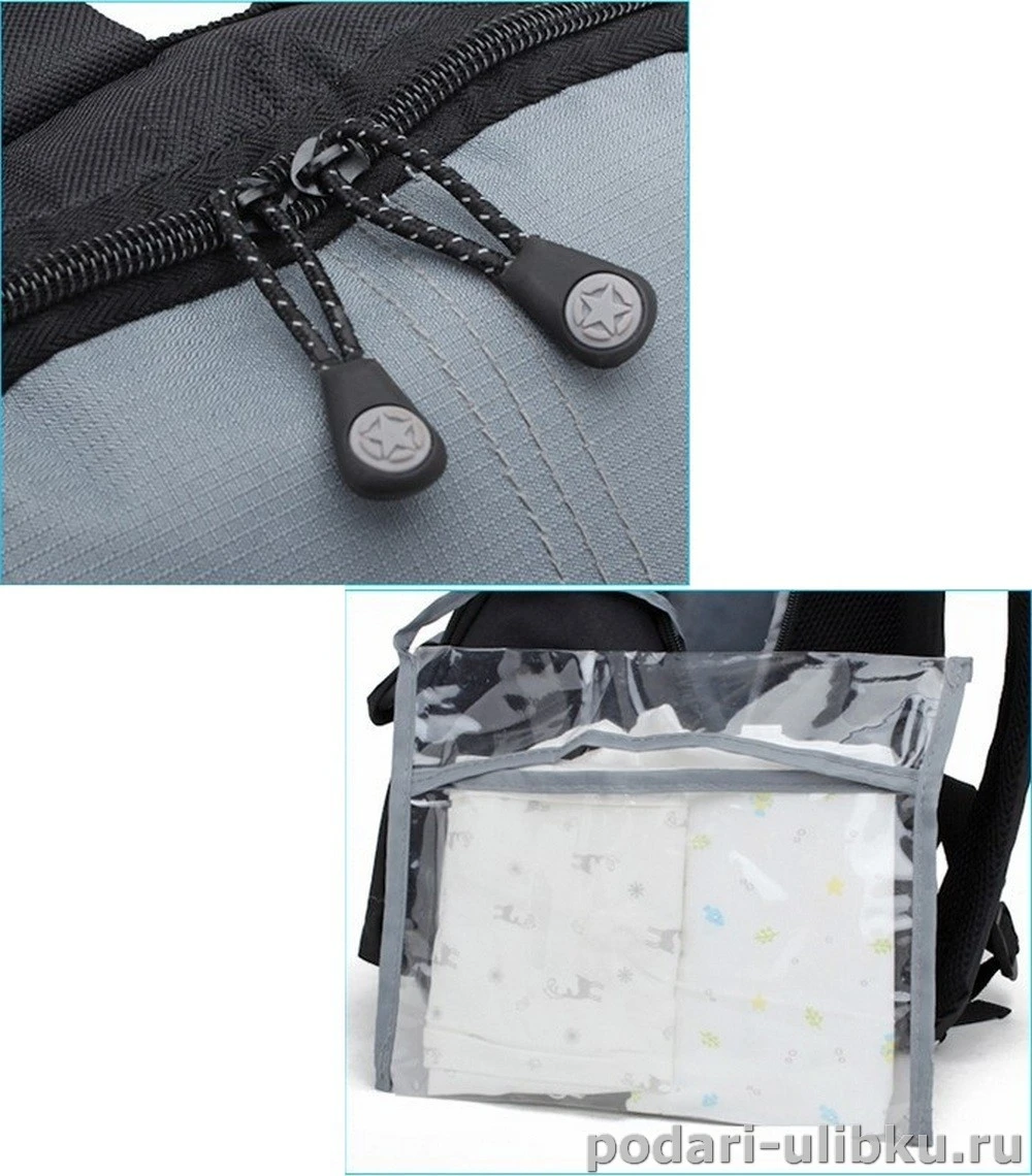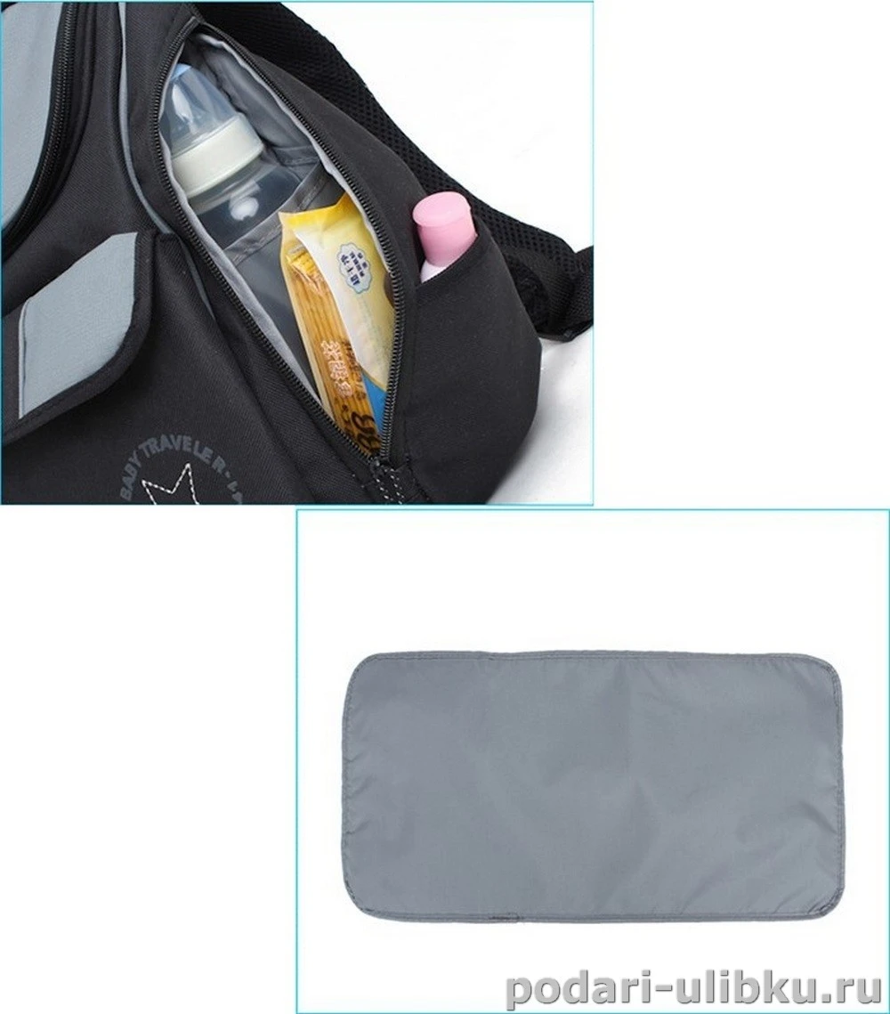 В комплекте к сумке идет пеленальный коврик и файл для подгузников или грязных вещей. Это поможет без труда поменять малышу подгузник в любом месте.